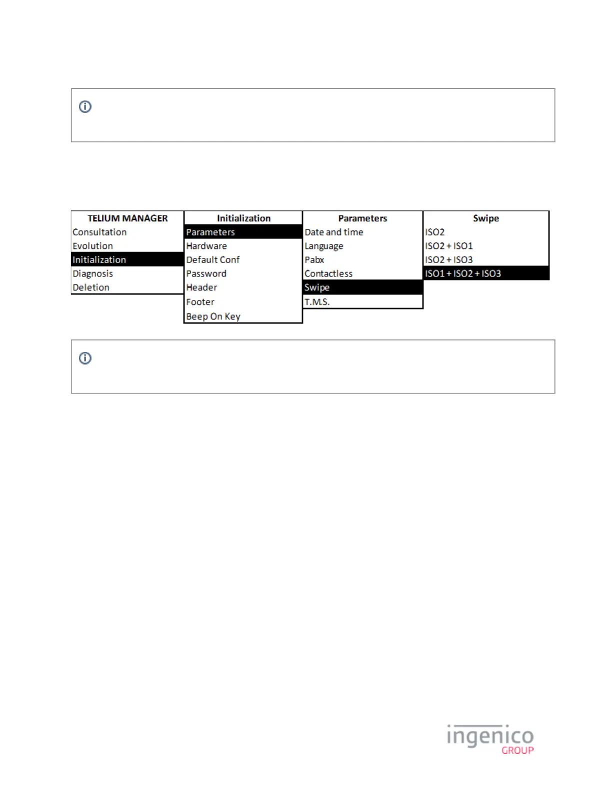 ISO refers to the MSR tracks to be read. To verify that the correct ISO is selected, choose the [Initialization] option from the Telium