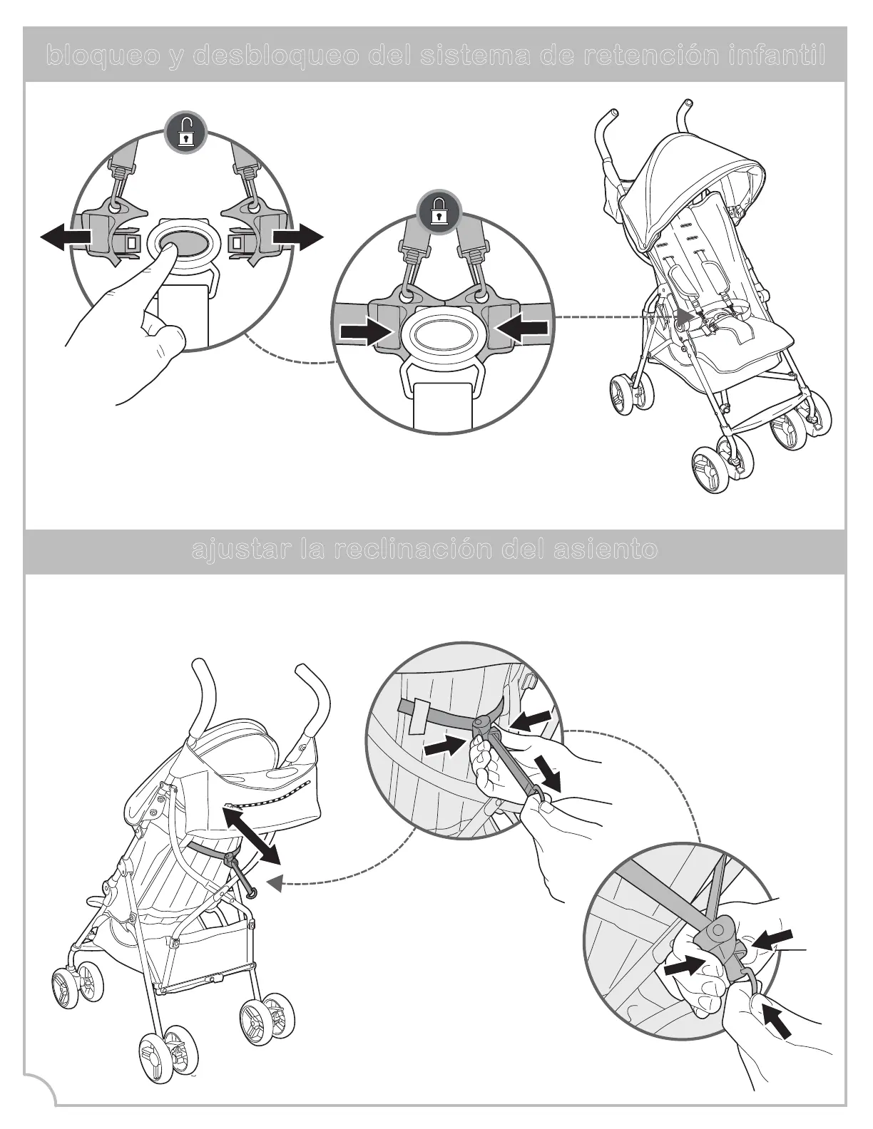 Apriete la pinza de reclinación del asiento en la parte trasera del cochecito y tire o suelte las