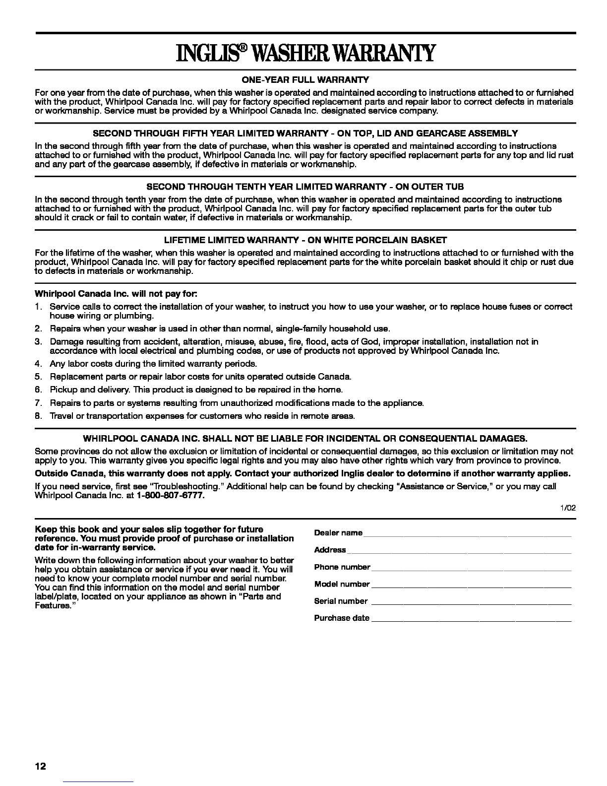 attached to or furnished with the product, Whirlpool Canada Inc. will pay for factory specified replacement parts for the outer tub