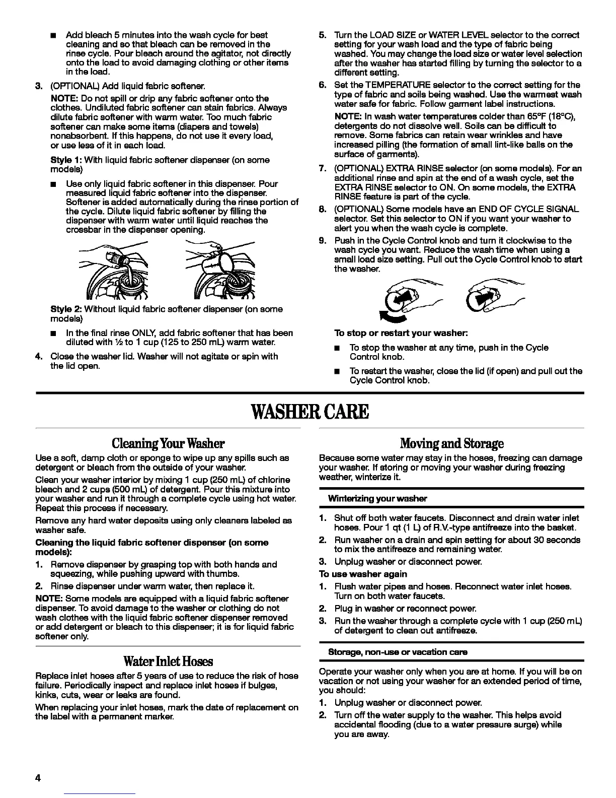 your washer. If storing or moving your washer during freezing