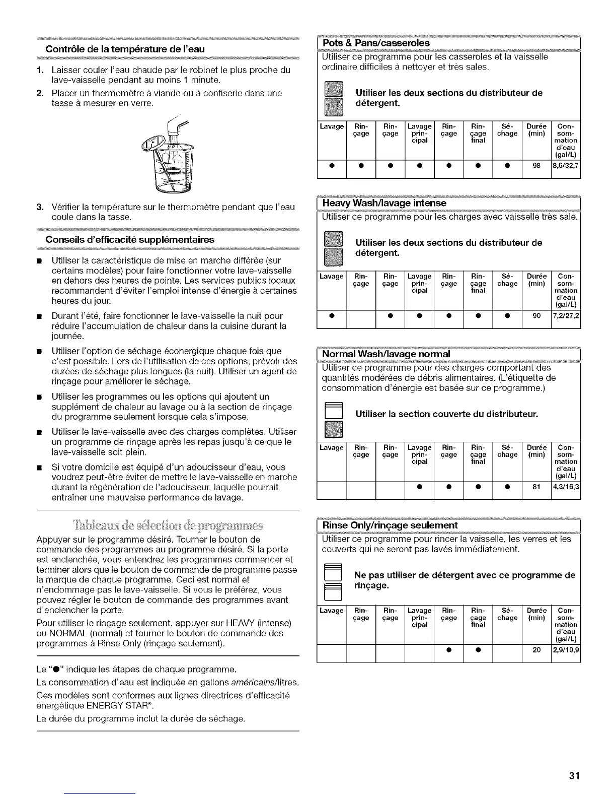 La consommation d'eau est indiquee en gallons am_ricains/litres.