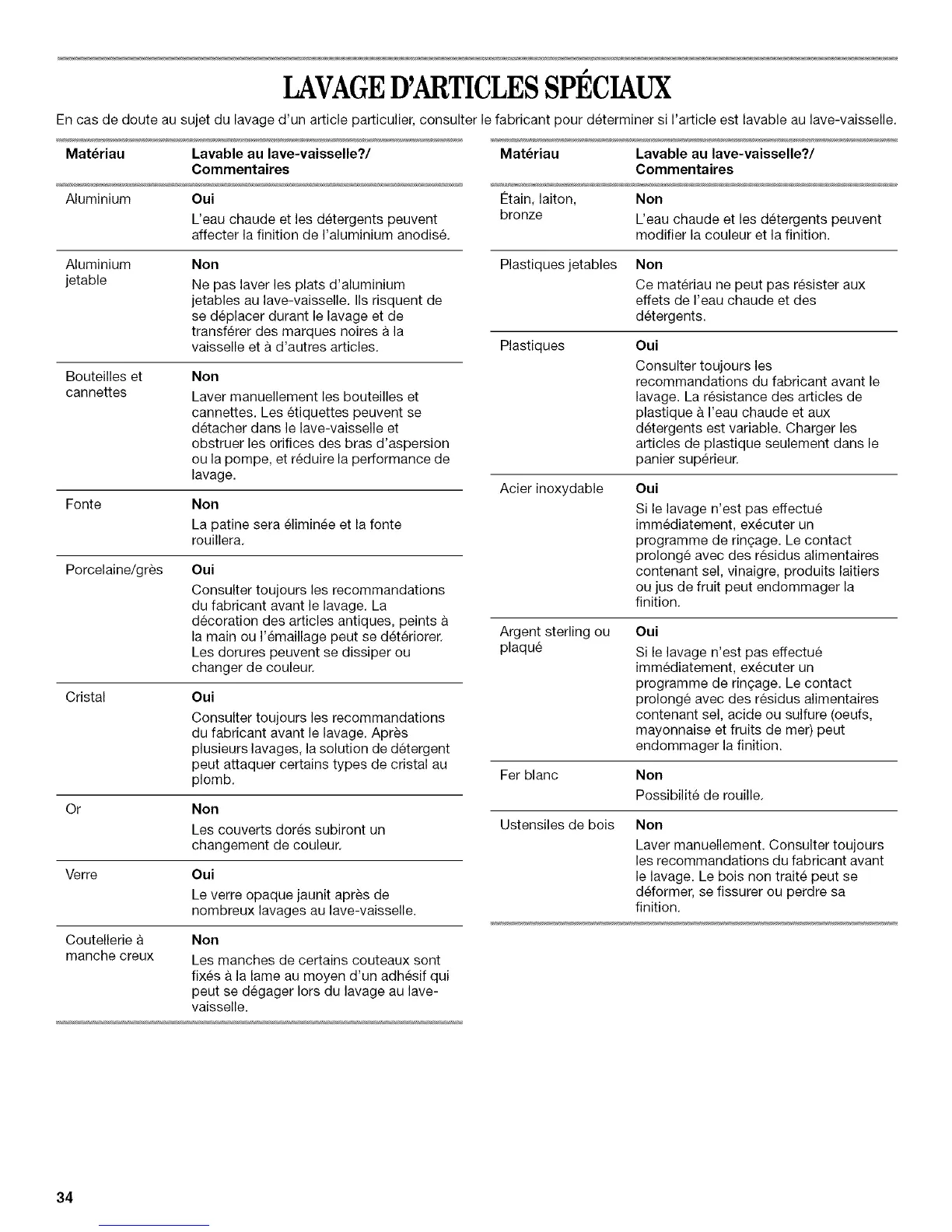 En cas de doute au sujet du lavage d'un article particulier, consulter le fabricant pour determiner si I'article est lavable au lave-vaisselle.