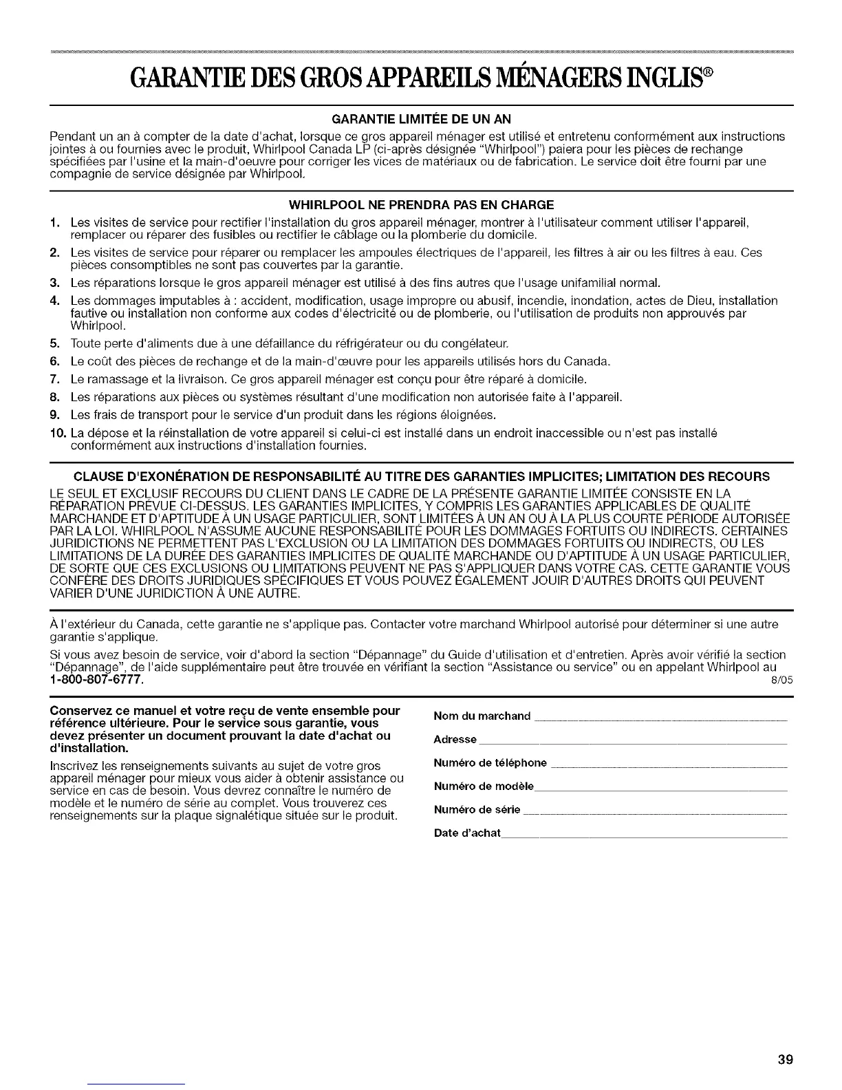 PAR LA LOI. WHIRLPOOL N'ASSUME AUCUNE RESPONSABILITE POUR LES DOMMAGES FORTUITS OU INDIRECTS. CERTAINES