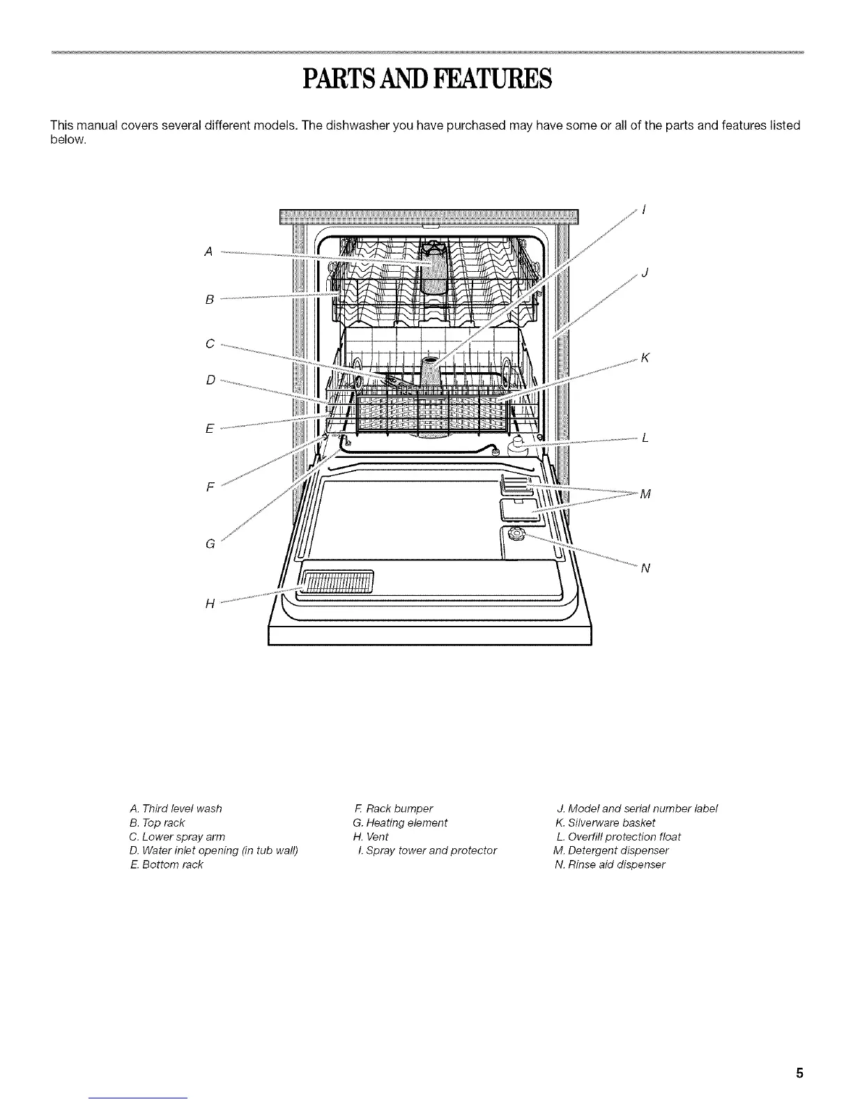 This manual covers several different models. The dishwasher you have purchased may have some or all of the parts and features listed