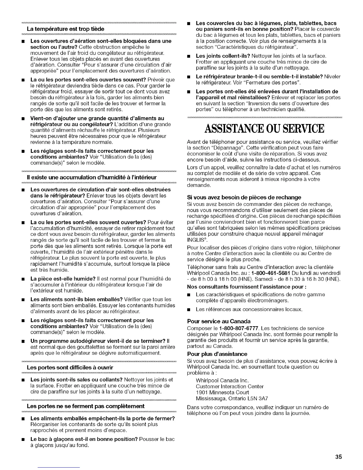Whirlpool Canada Inc. au : 1-800-461-5681 Du lundi au vendredi