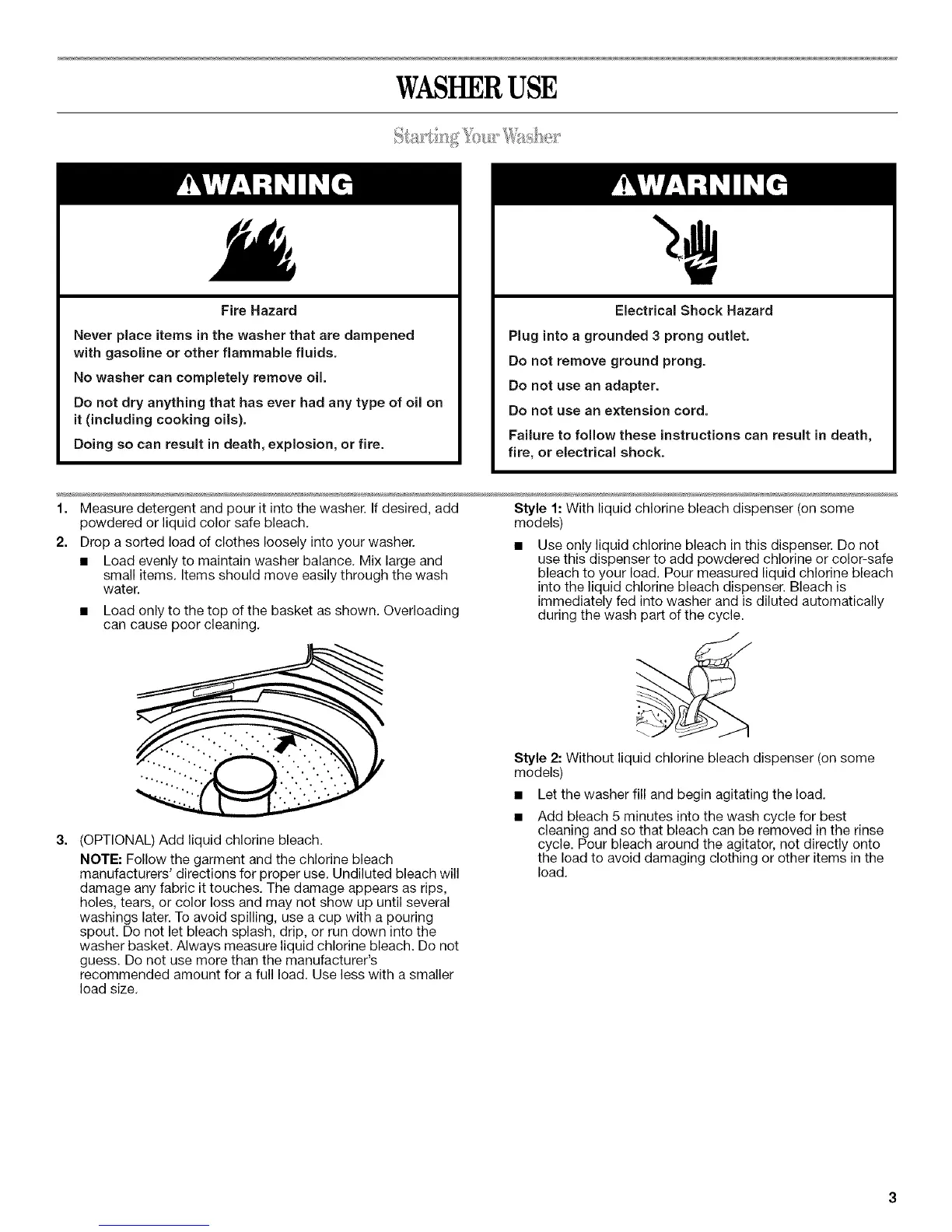 washer basket. Always measure liquid chlorine bleach. Do not