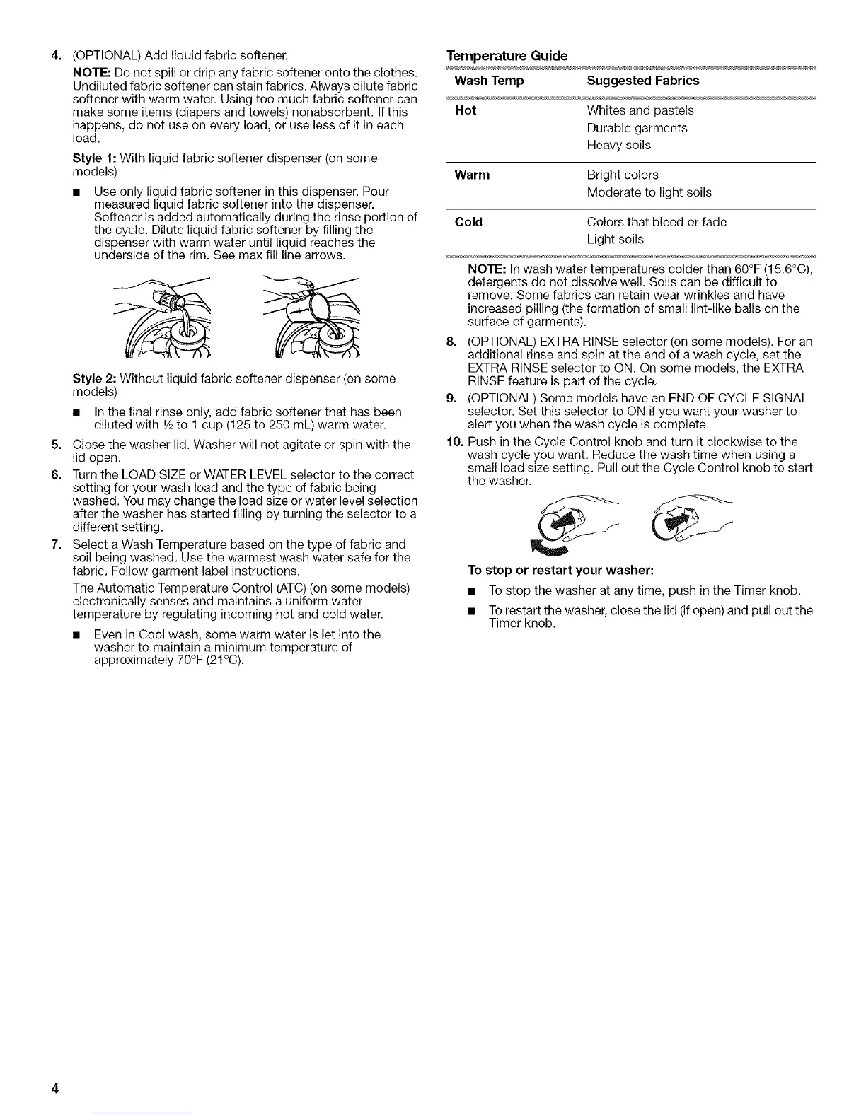 • To stop the washer at any time, push in the Timer knob.
