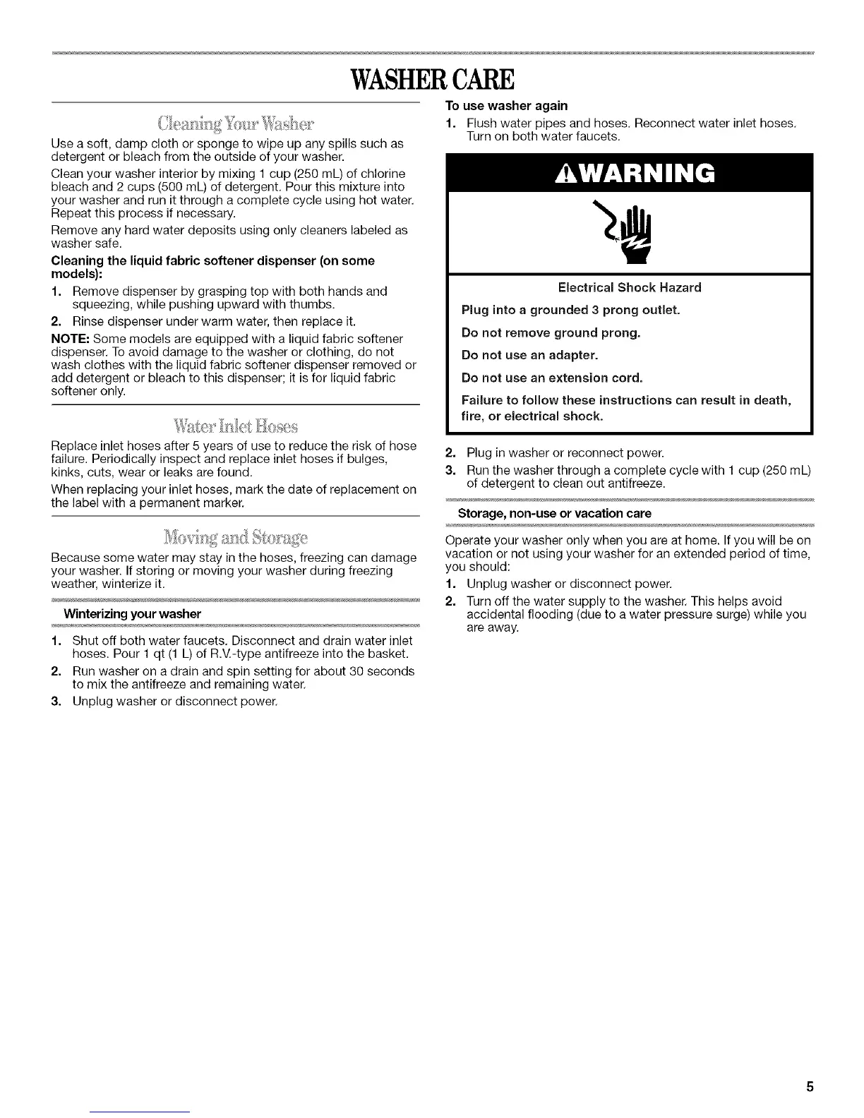 vacation or not using your washer for an extended period of time,
