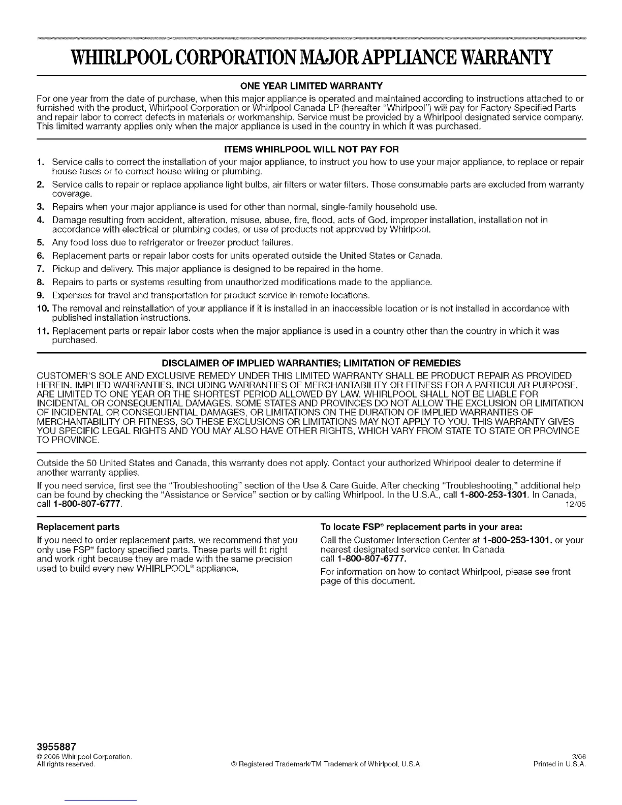 furnished with the product, Whirlpool Corporation or Whirlpool Canada LP (hereafter "Whirlpool") will pay for Factory Specified Parts