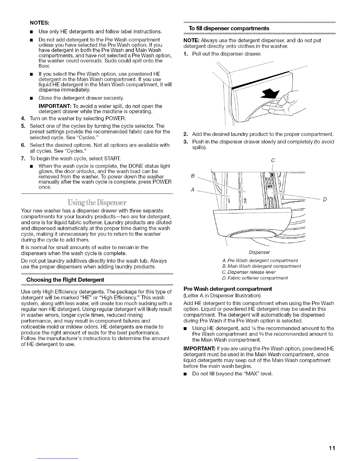 NOTE: Always use the detergent dispenser, and do not put