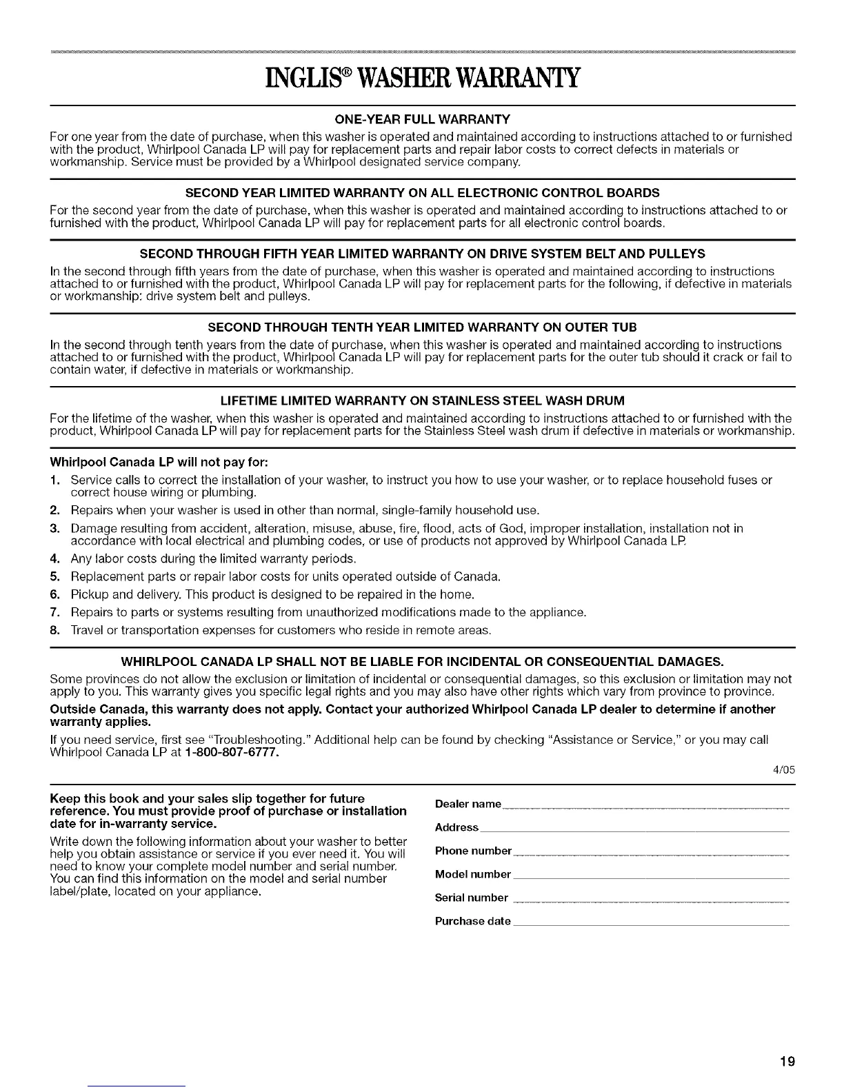 Outside Canada, this warranty does not apply. Contact your authorized Whirlpool Canada LP dealer to determine if another