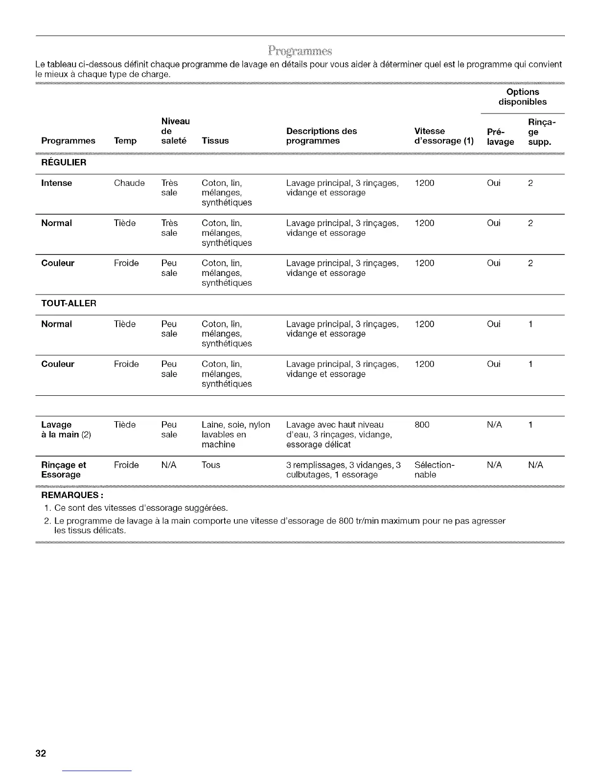 Programmes Temp salet_ Tissus programmes d'essorage (1) lavage supp.