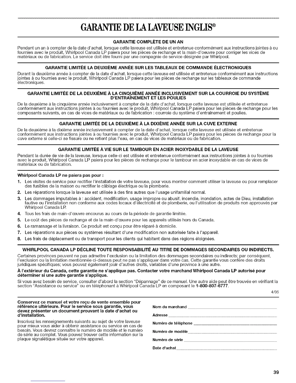 WHIRLPOOL CANADA LP DI_CLINE TOUTE RESPONSABILITI_ AU TITRE DE DOMMAGES SECONDAIRES OU INDIRECTS.