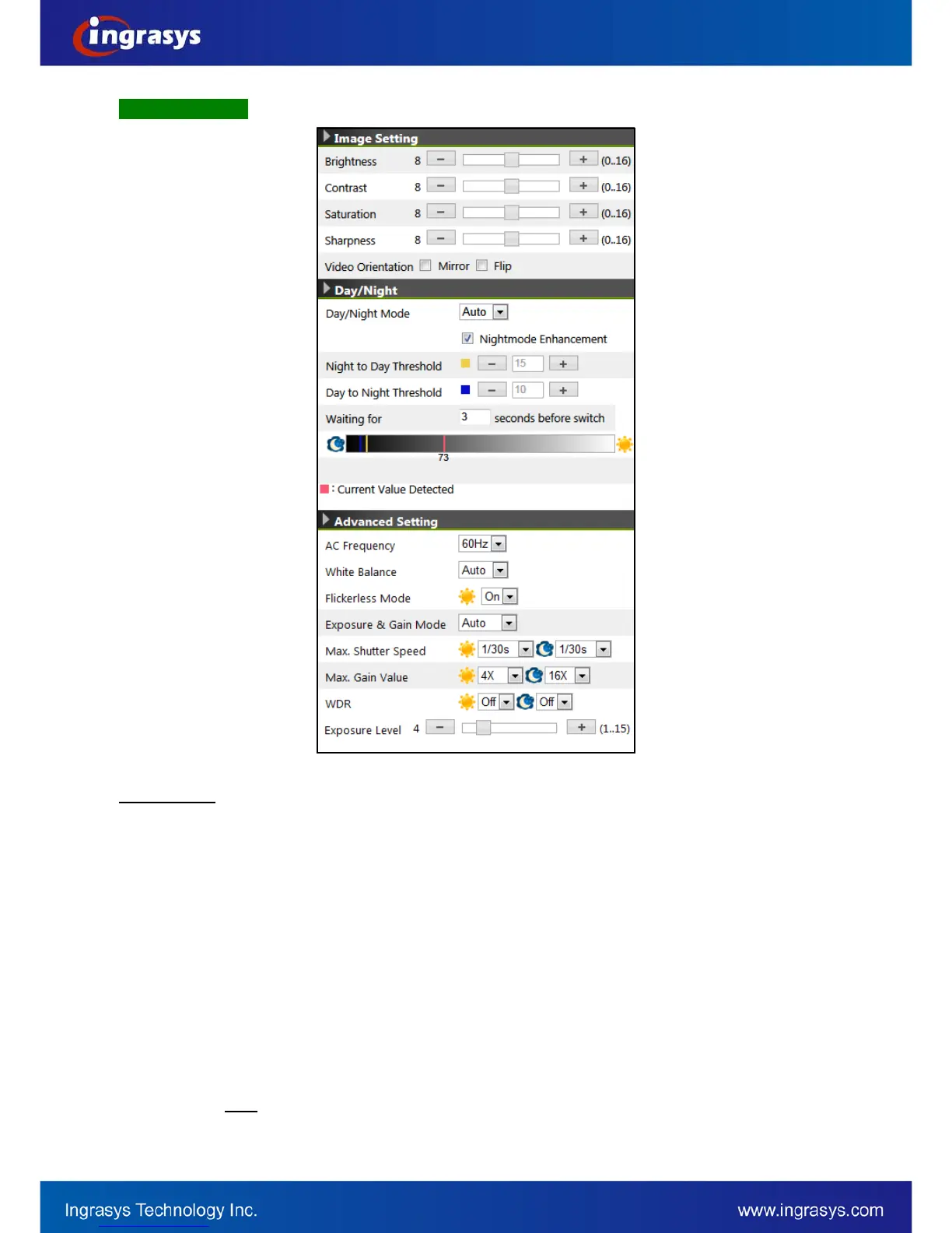 Brightness: the luminance of image view. Default value is 8; adjustable from 0 to 16.