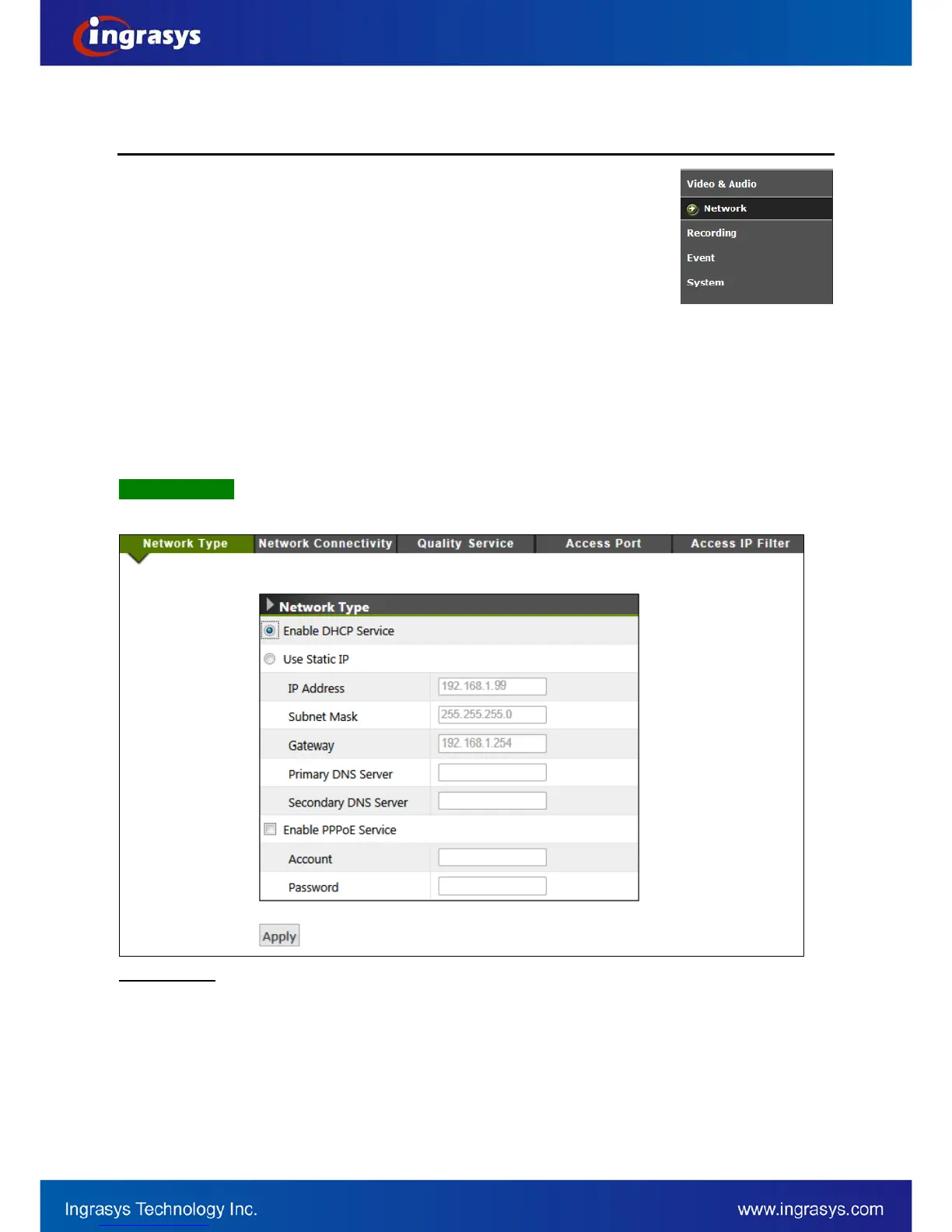 There are 3 ways to configure IP address for the IP camera device, including DHCP, Static IP and PPPoE.