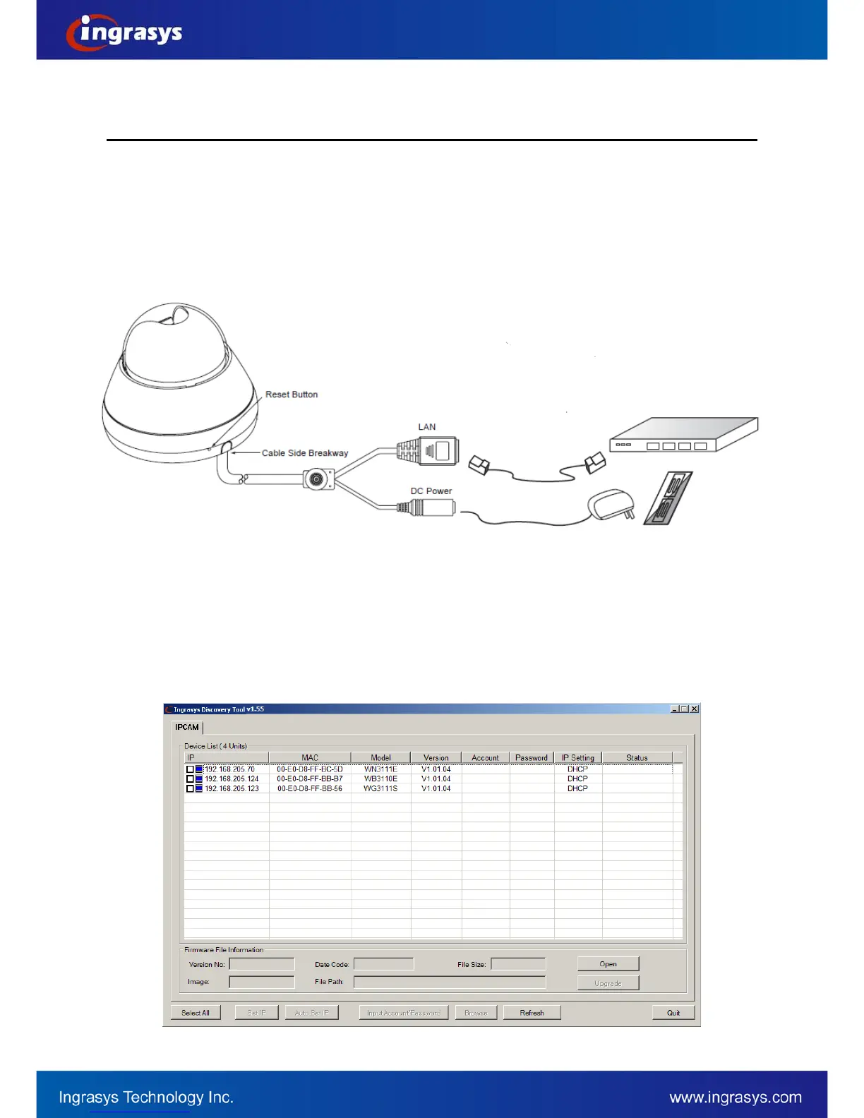 After completing the hardware installation, run ingrasysDiscovery.exe to search for the IP camera installed.