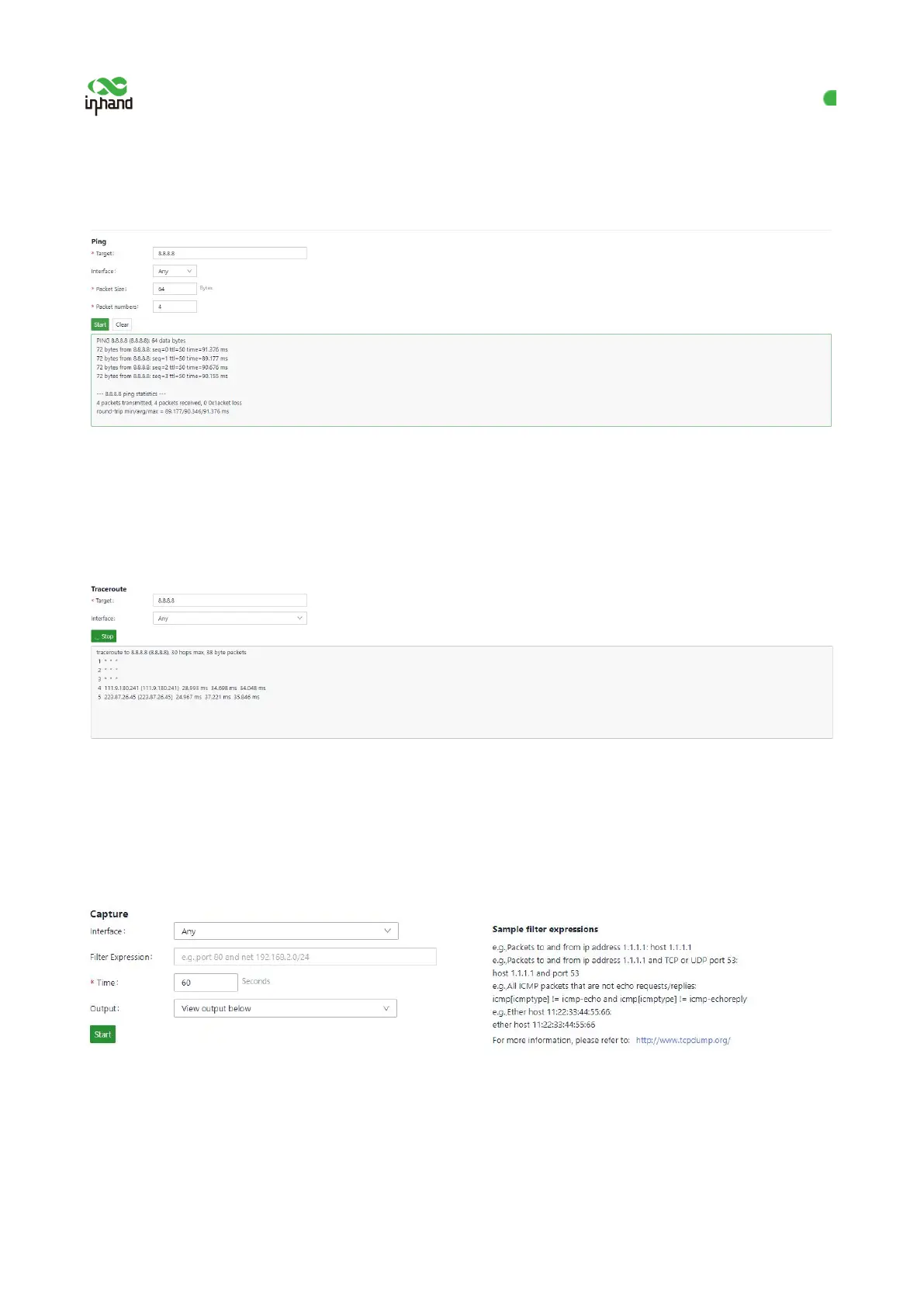 You can capture data packets on a specified interface. By selecting an option from the Output drop-down