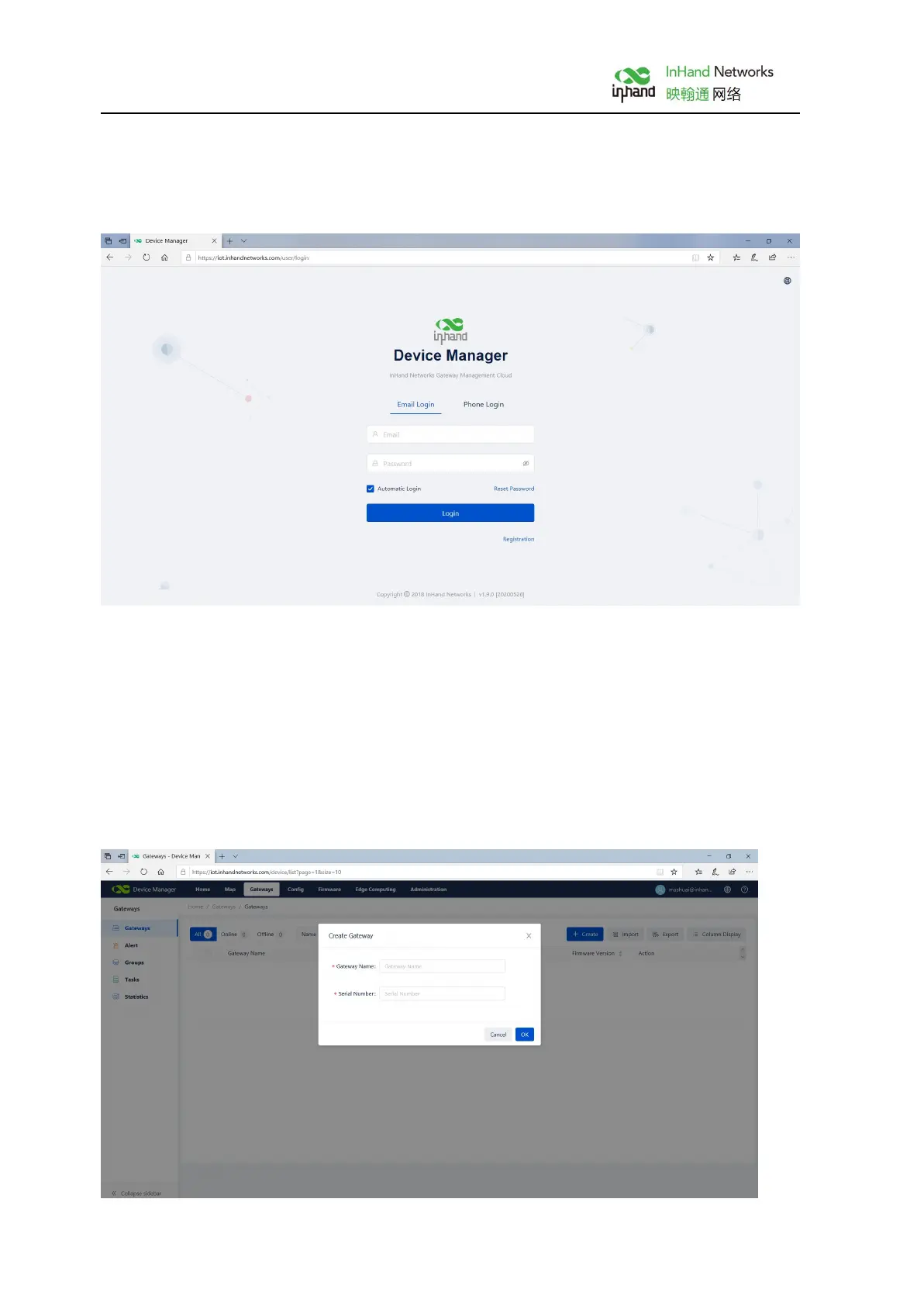 Login to DM platform address https://iot.inhandnetworks.com, click on "Gateway >> Create" menu to add