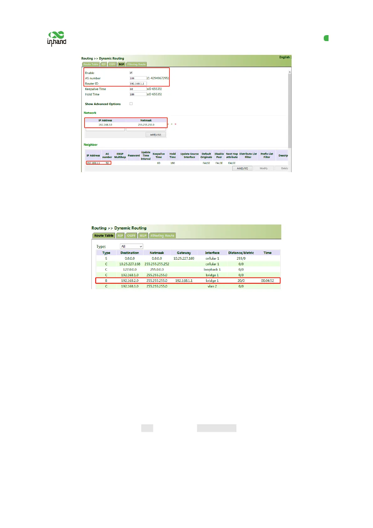 dynamic route is added successfully. The BGP route learned by VG710_B is shown in the figure
