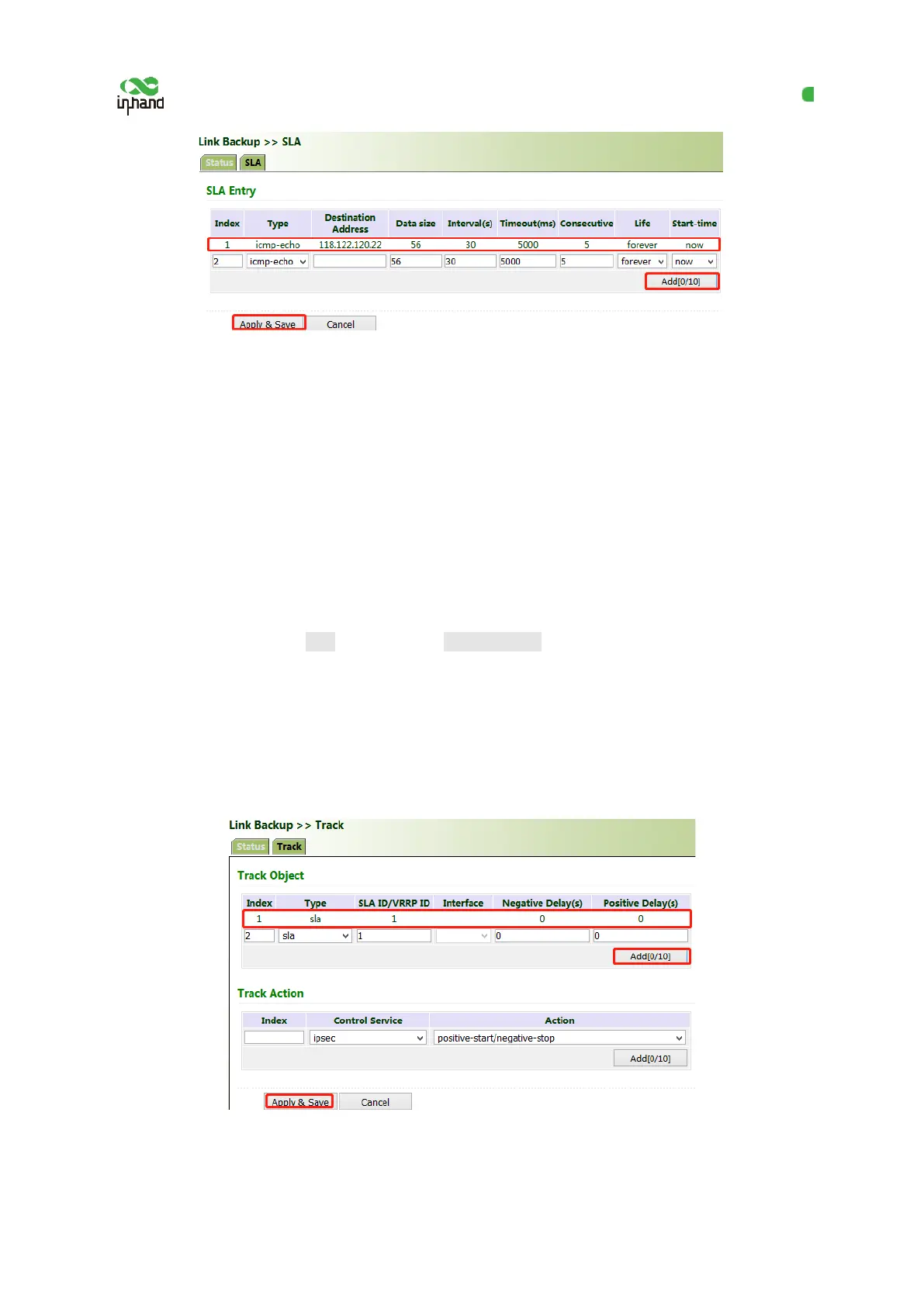 Click "Link Backup >> Track >> Track", set "Index" as required, select "sla", "interface", or "vrrp" for