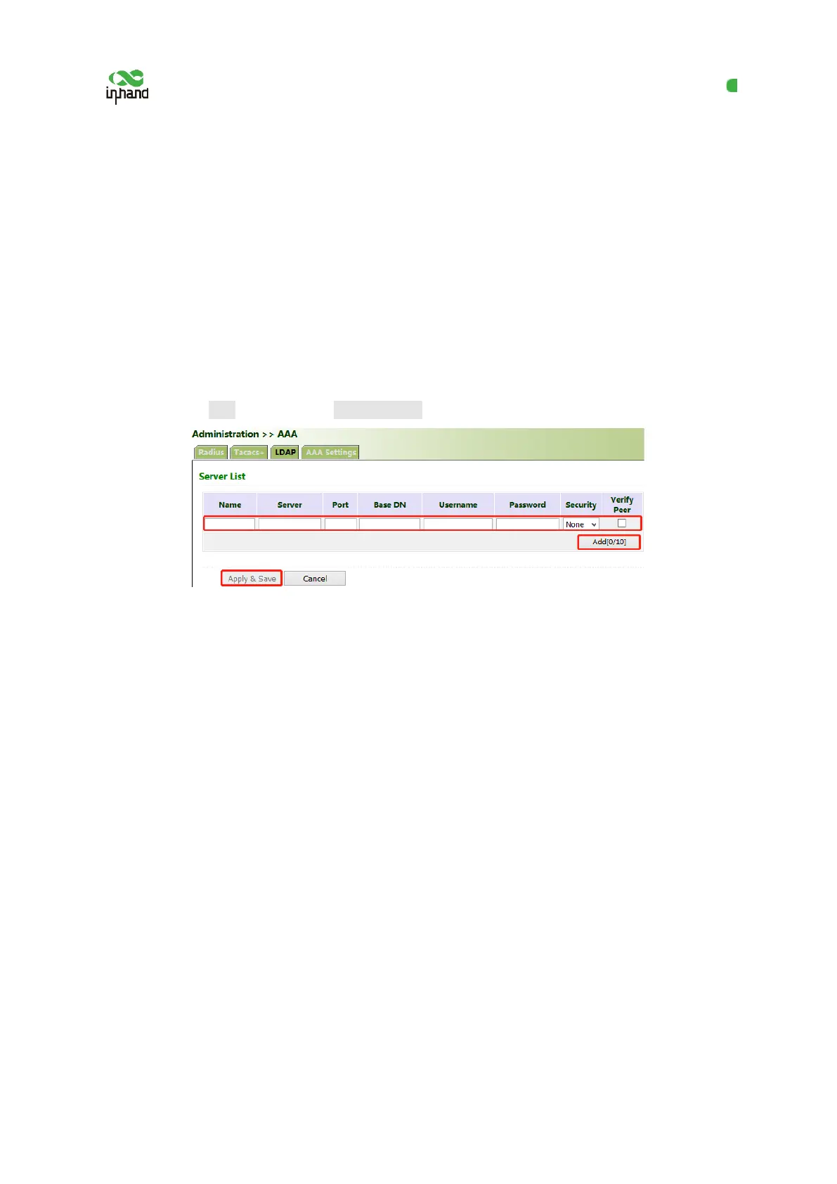 Click "Administration >> AAA >> LDAP". In "Server List", enter any name for "Name", enter the