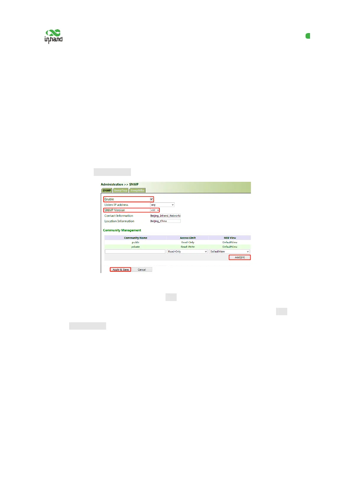 Click "Administration >> SNMP >> SNMP", check "Enable", select "v1c" for "v2c" for "SNMP