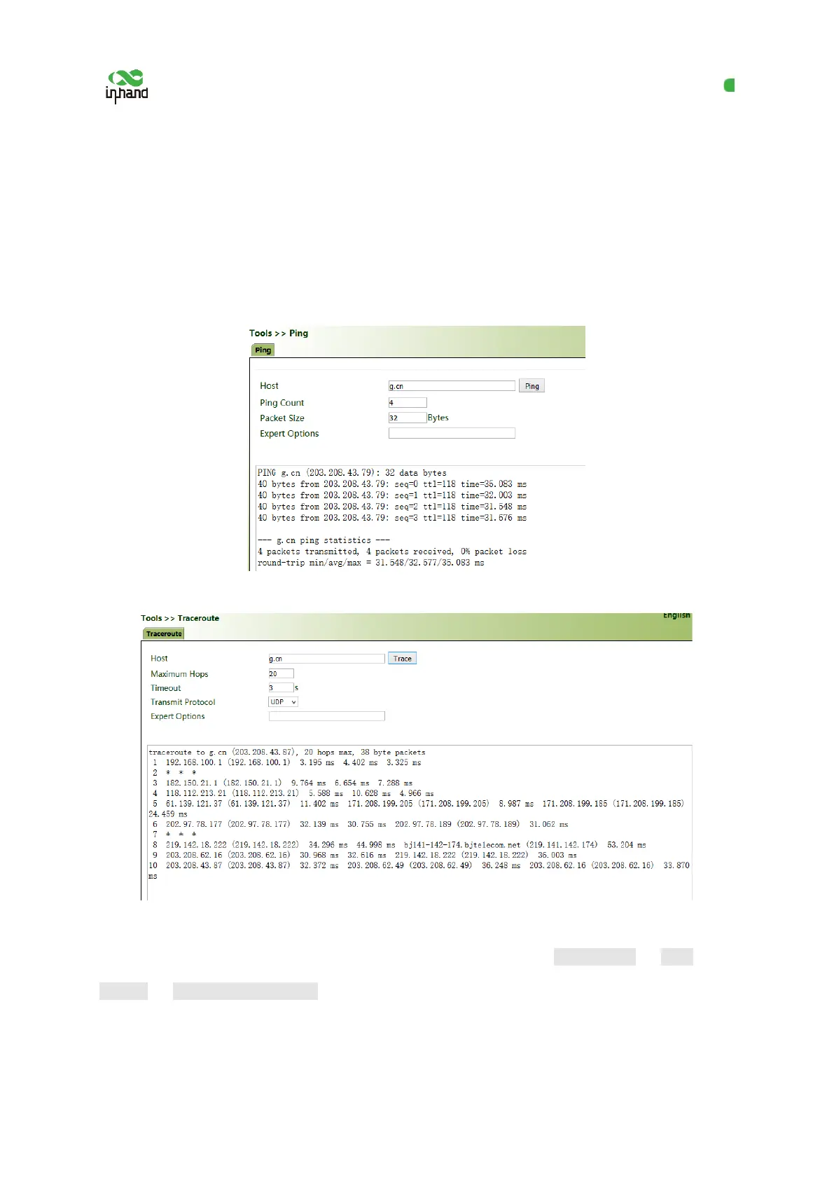 Diagnostic tools are used to detect the network connection of the gateway: Ping, Traceroute,