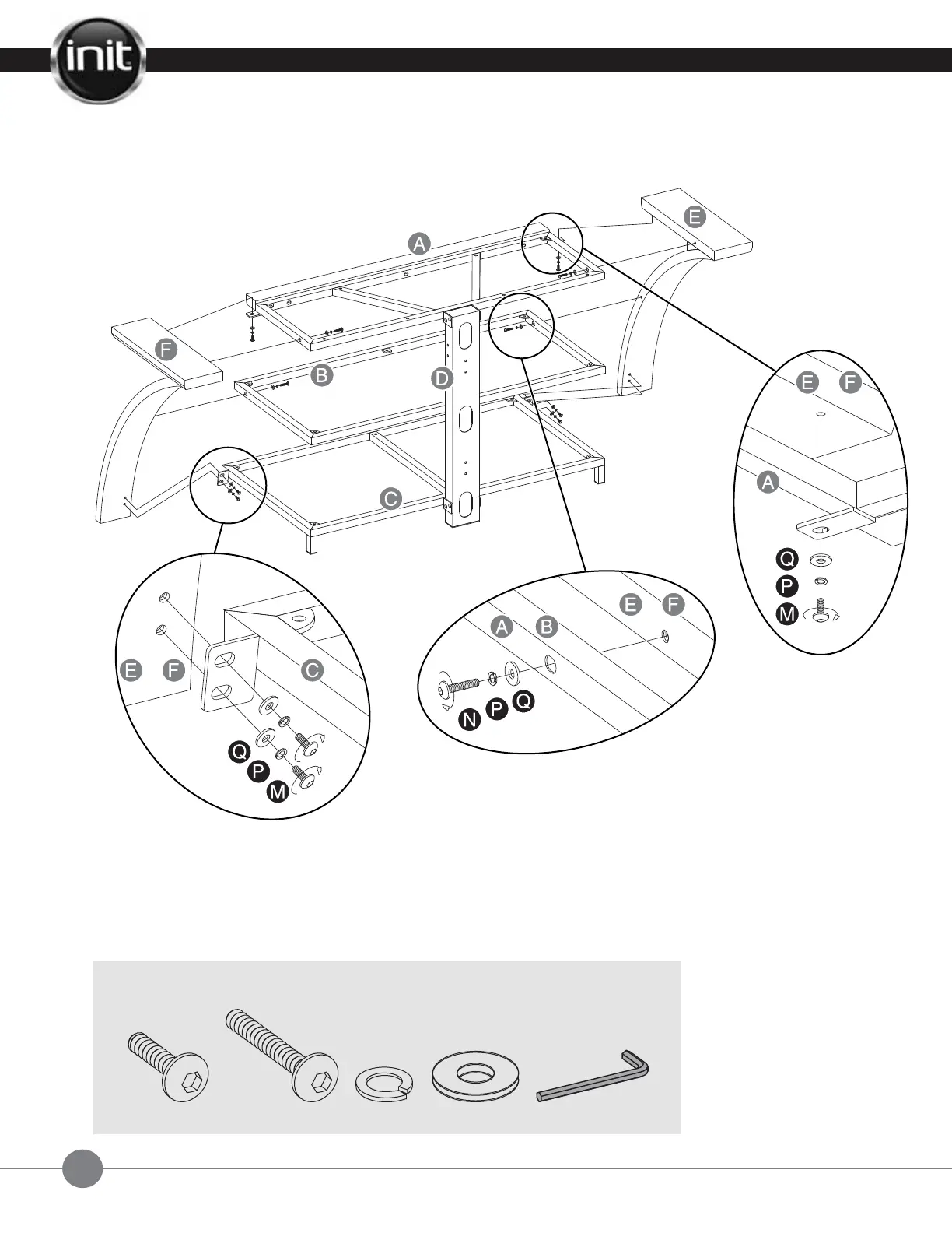 Step 2 Attach the left and right legs (E, F) to the shelf frames. Make sure that the tops are flush with the wood front