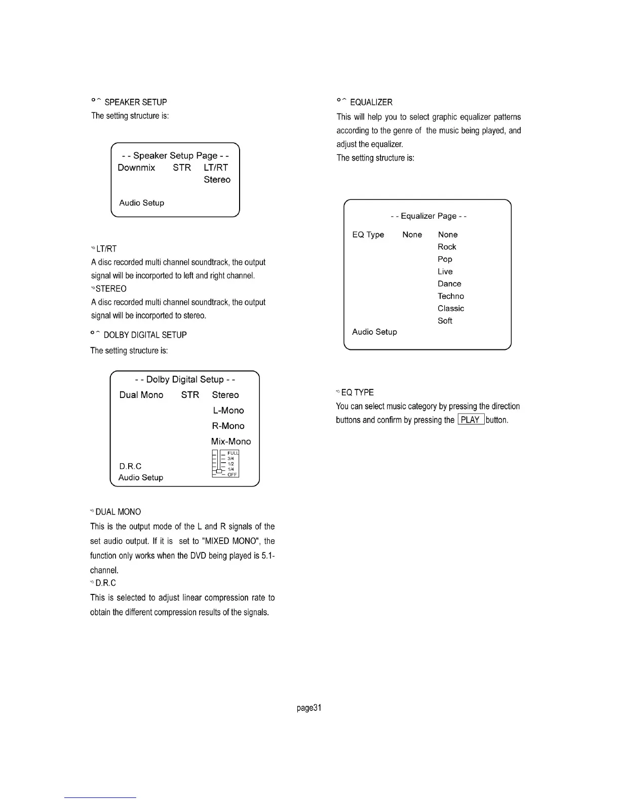 Initial DMA-710 - Audio Setup; Speaker Setup; Equalizer; Dolby Digital Setup