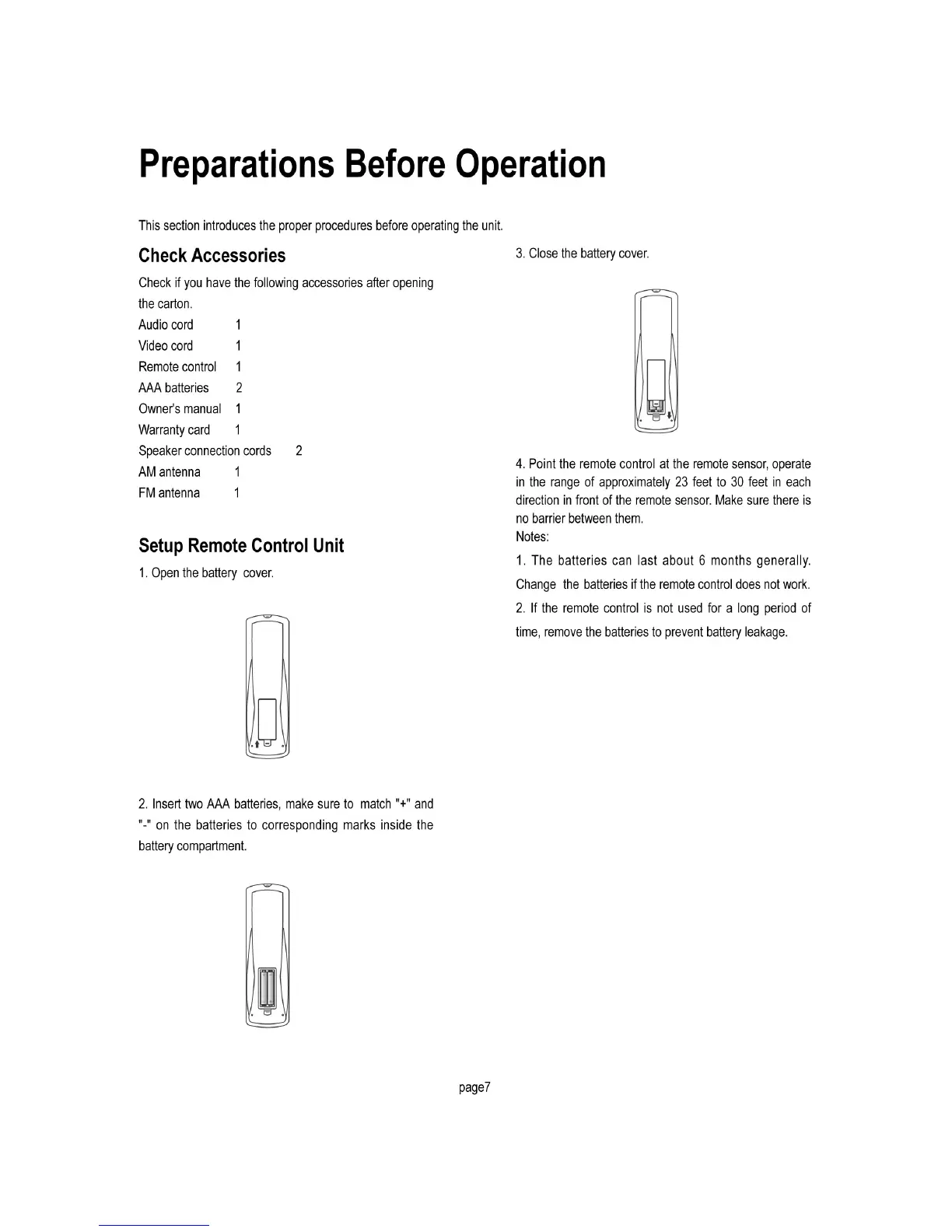 Initial DMA-710 - Preparations Before Operation; Check Accessories; Setup Remote Control Unit
