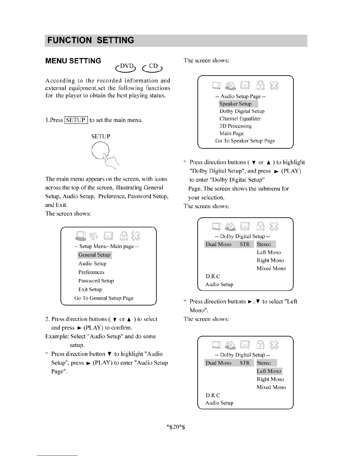 Initial DVD-5820 - Function Setting - Menu and Audio; Main Menu Navigation and Audio Setup