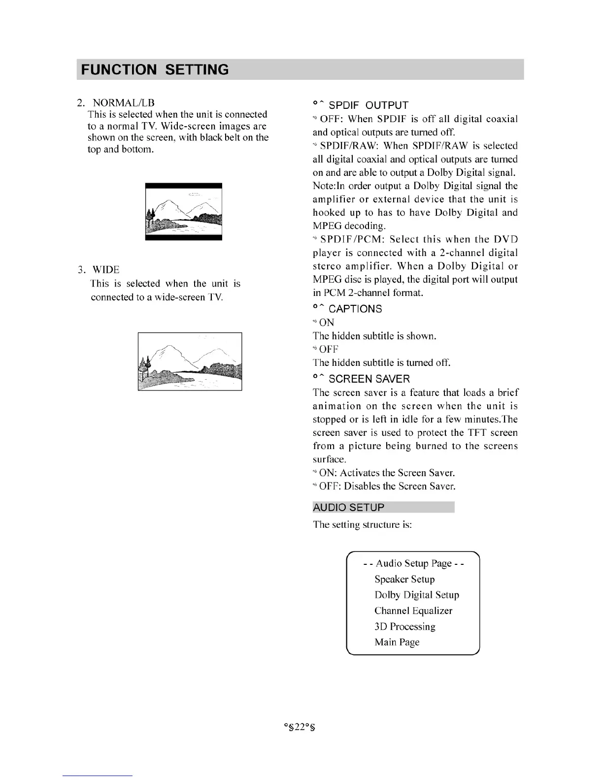 Initial DVD-5820 - Function Setting - Audio Output and Screen; Audio Output and Screen Saver Settings