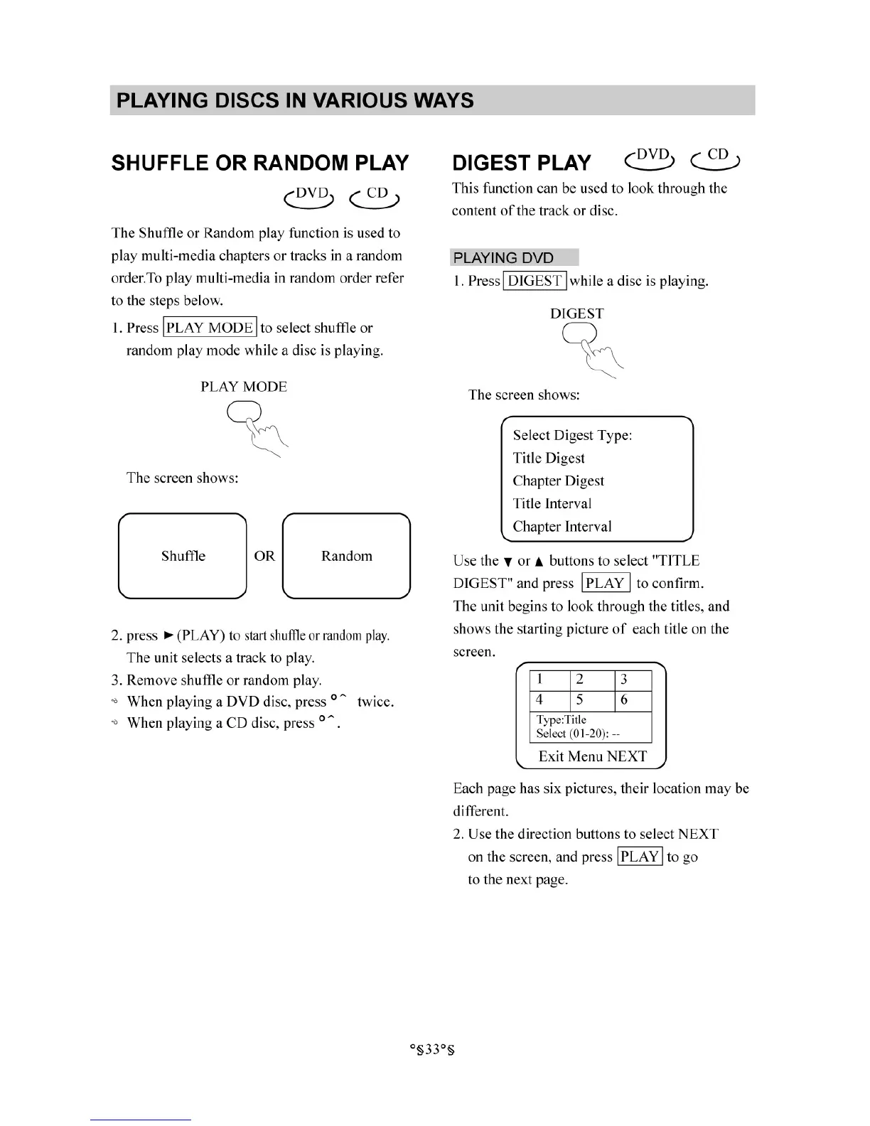 Initial DVD-5820 - Shuffle or Random Play; Digest Play
