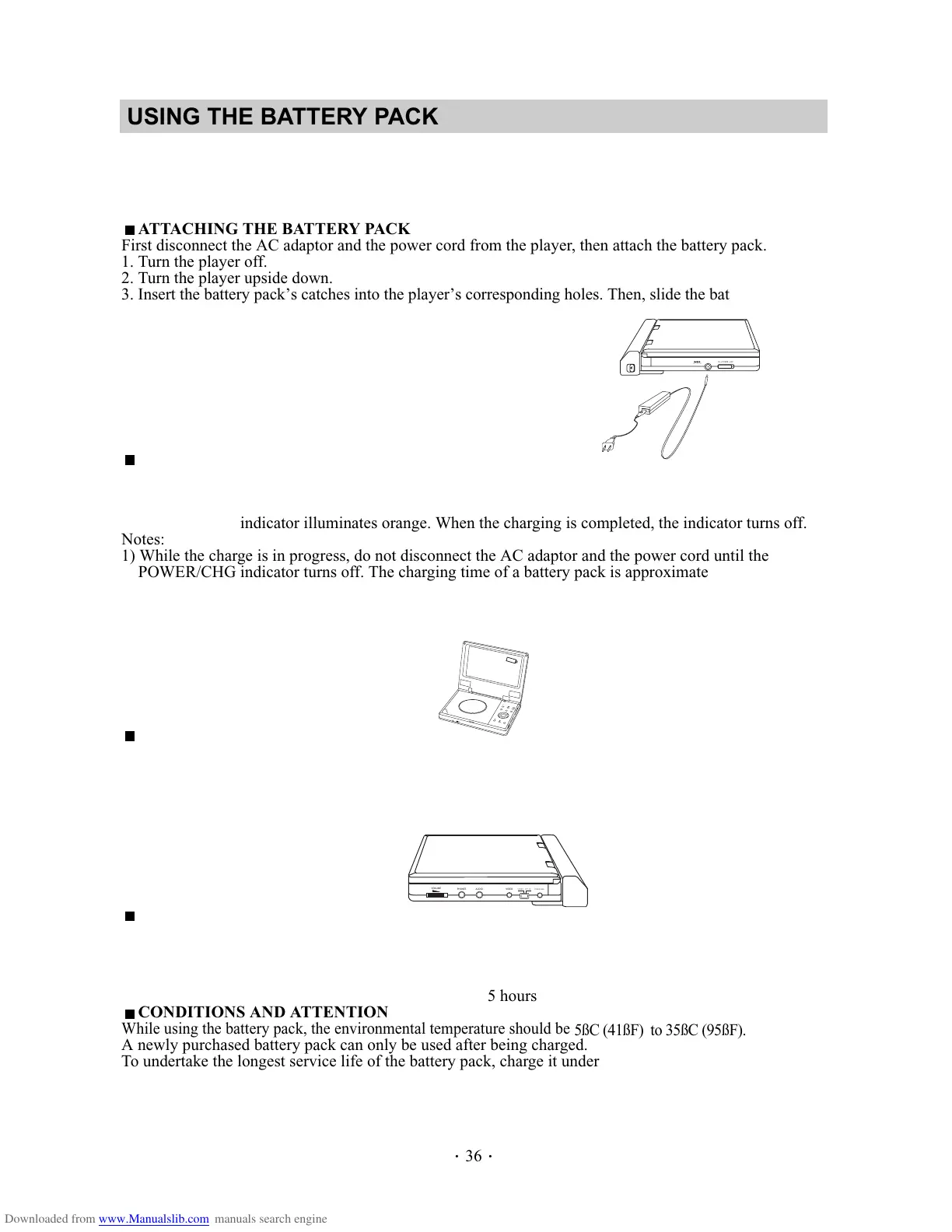 attached firmly to the player when using it. Otherwise, the battery may become detached and cause