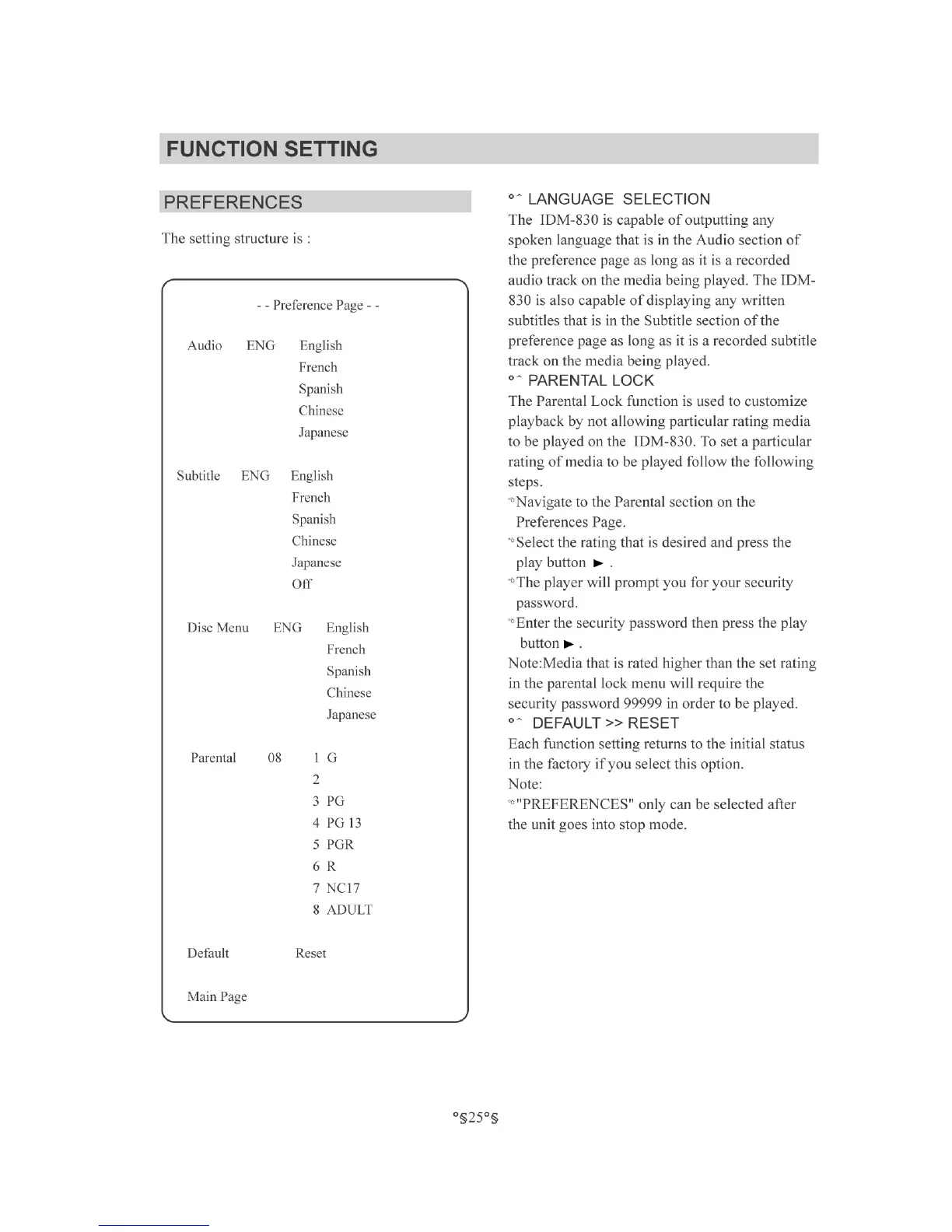 Initial IDM-830 - Preferences; Language Selection; Parental Lock; Default Reset