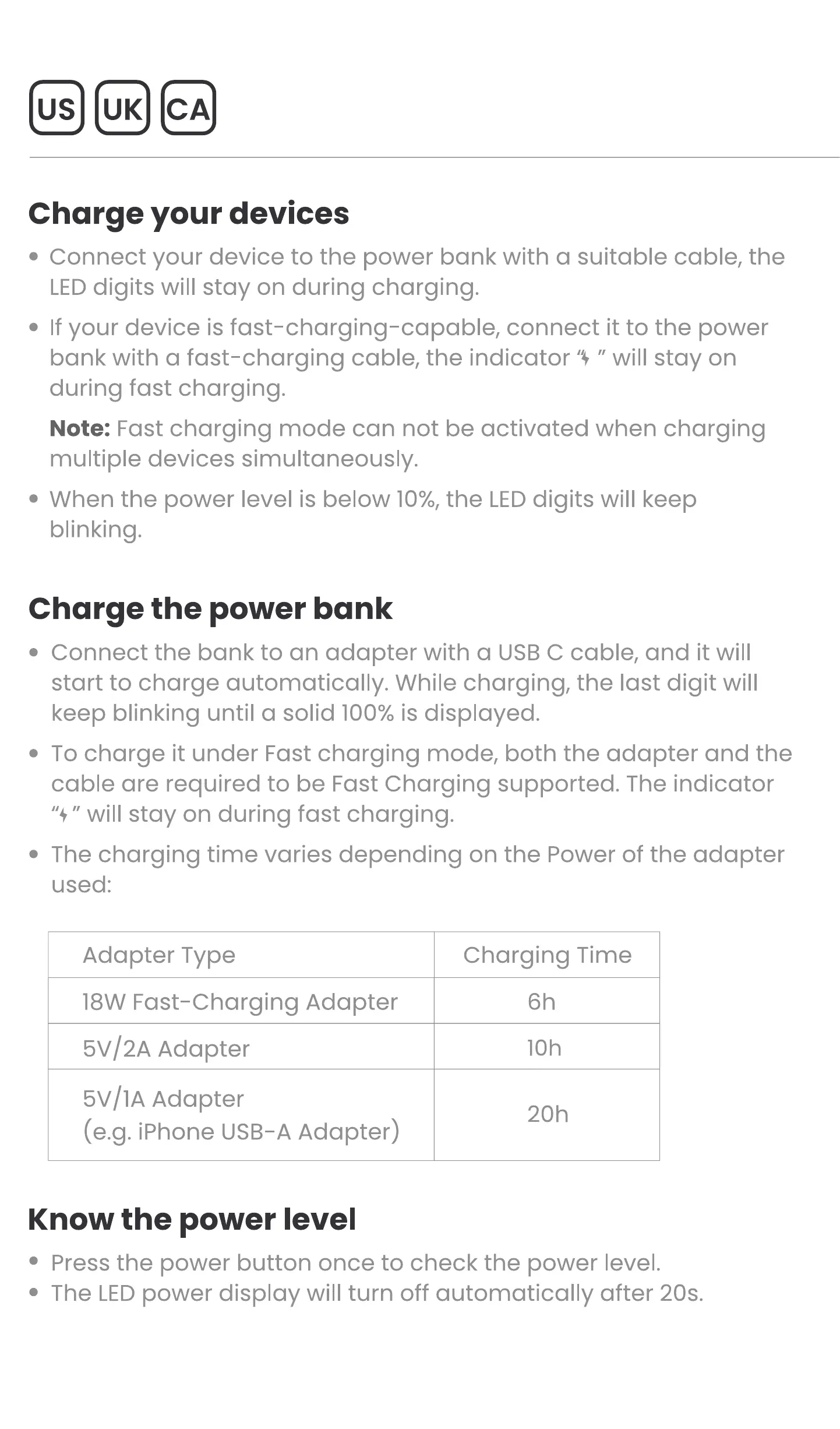Note: Fast charging mode can not be activated when charging