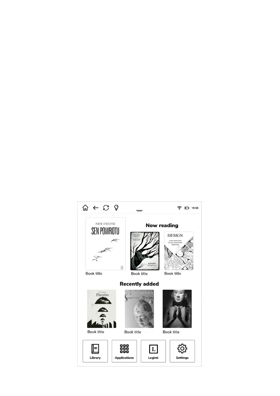 On the home screen of your inkBOOK you will find 4 information zones, 2 of them are up