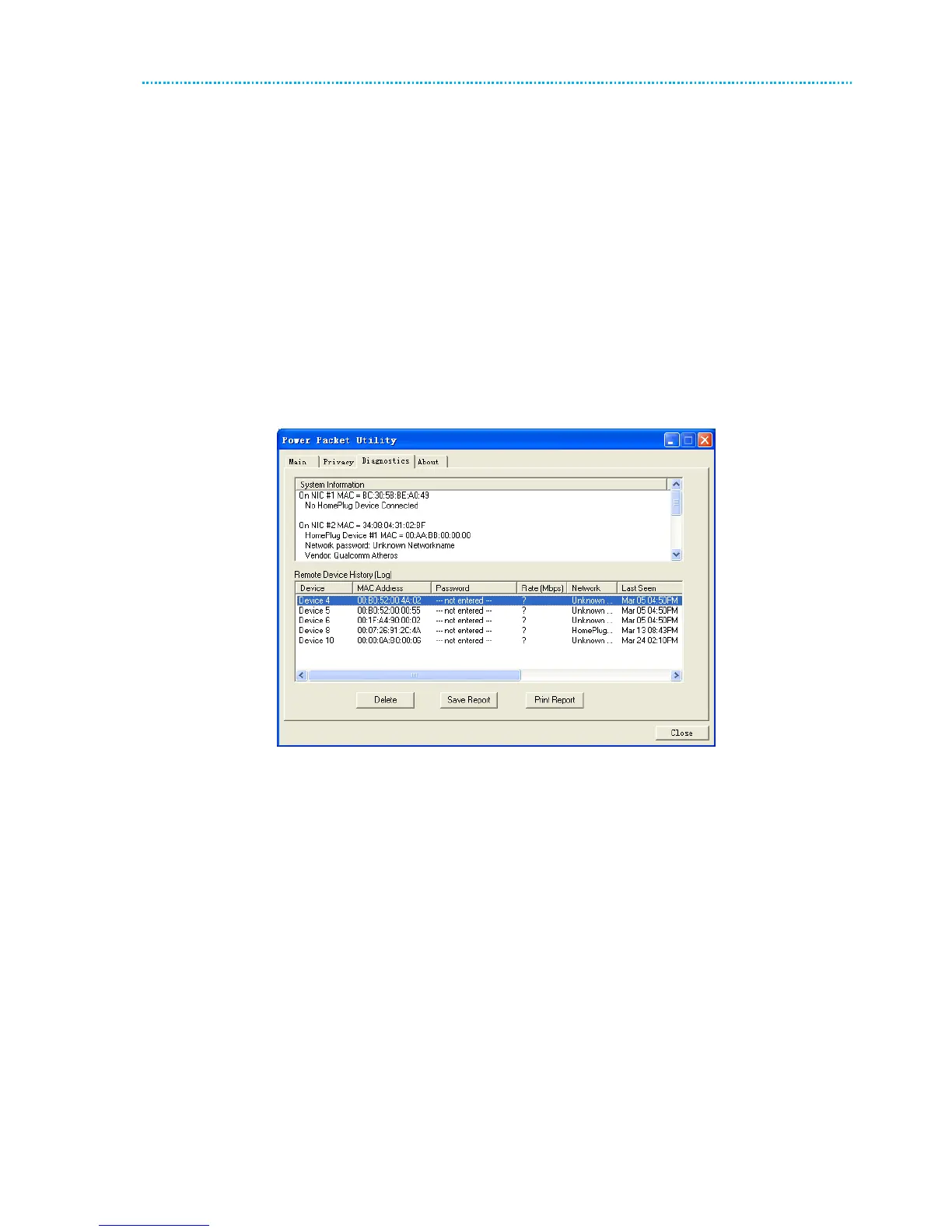 the devices and the parameters of the devices on the powerline network are listed. Devices that are active on the