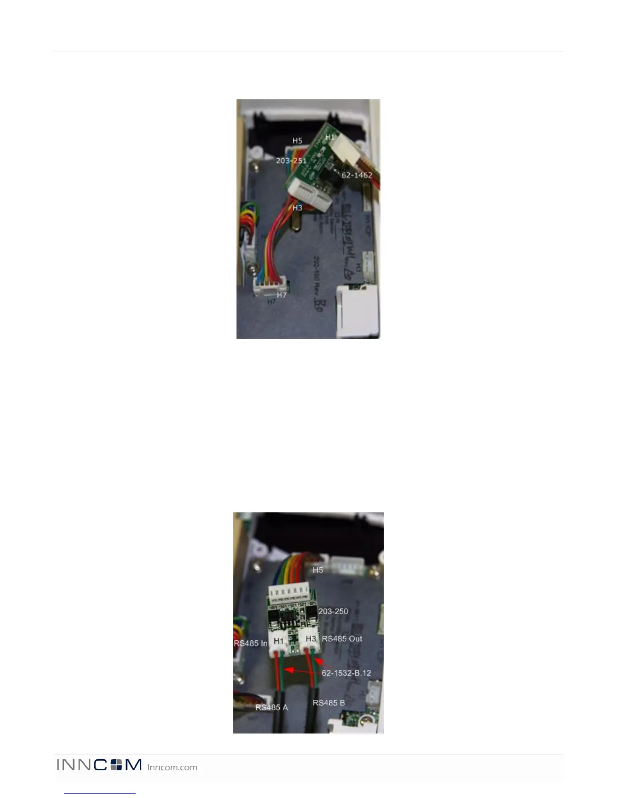 RS485 In header and the RS485 B pair going to the next thermostat to RS485 Out header on the 203-250.