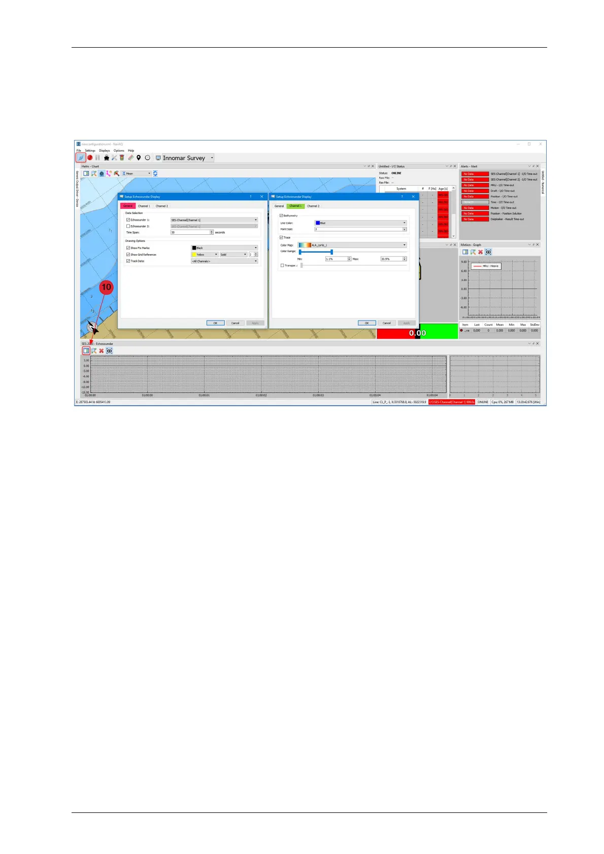 bathymetry line can be configured in this dialogue, as well as the setup of the colour mapping for