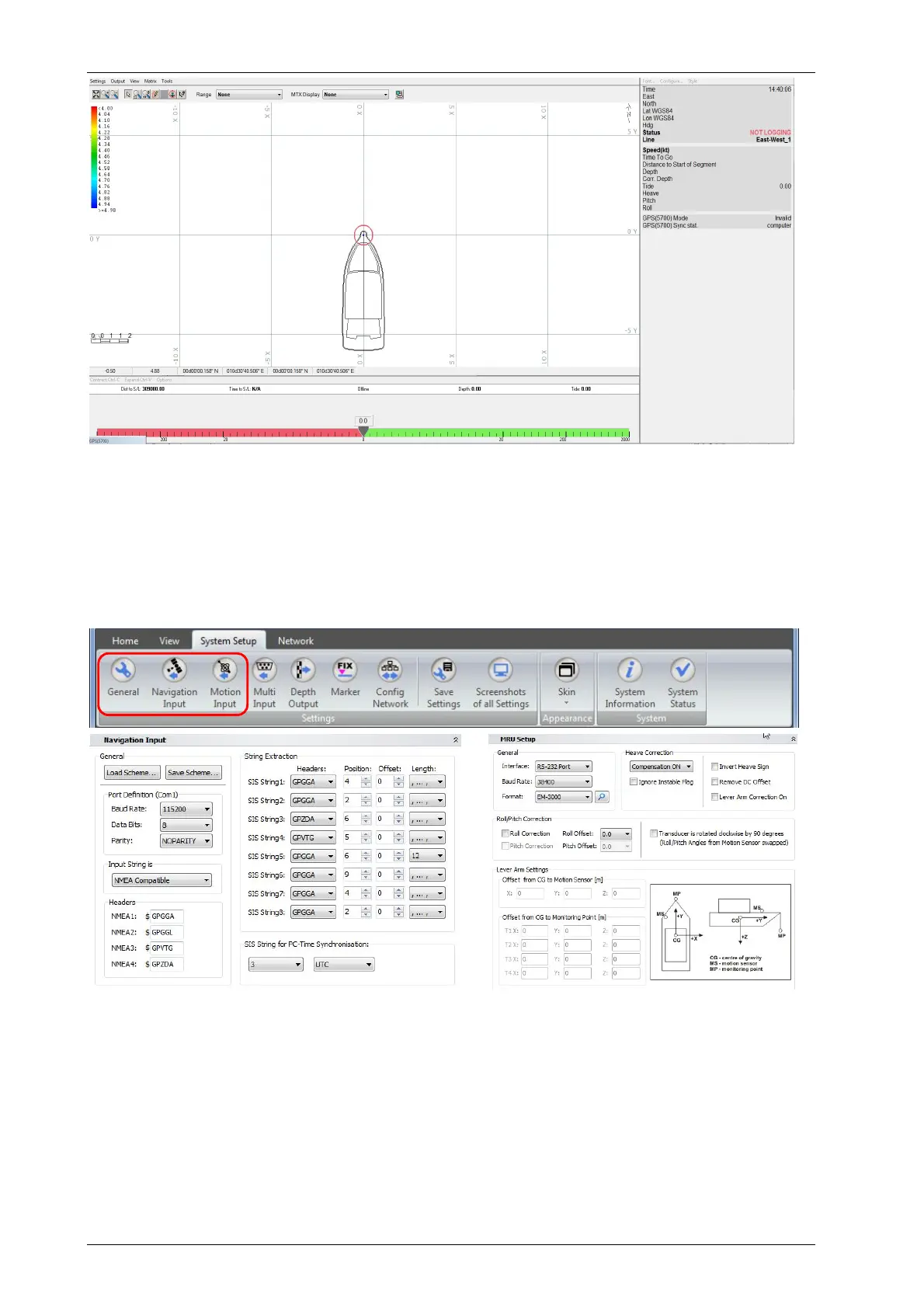 SESWIN “System Setup” toolbar (top) and dialogs for setting up the GNSS interface (bottom left) as well as the motion