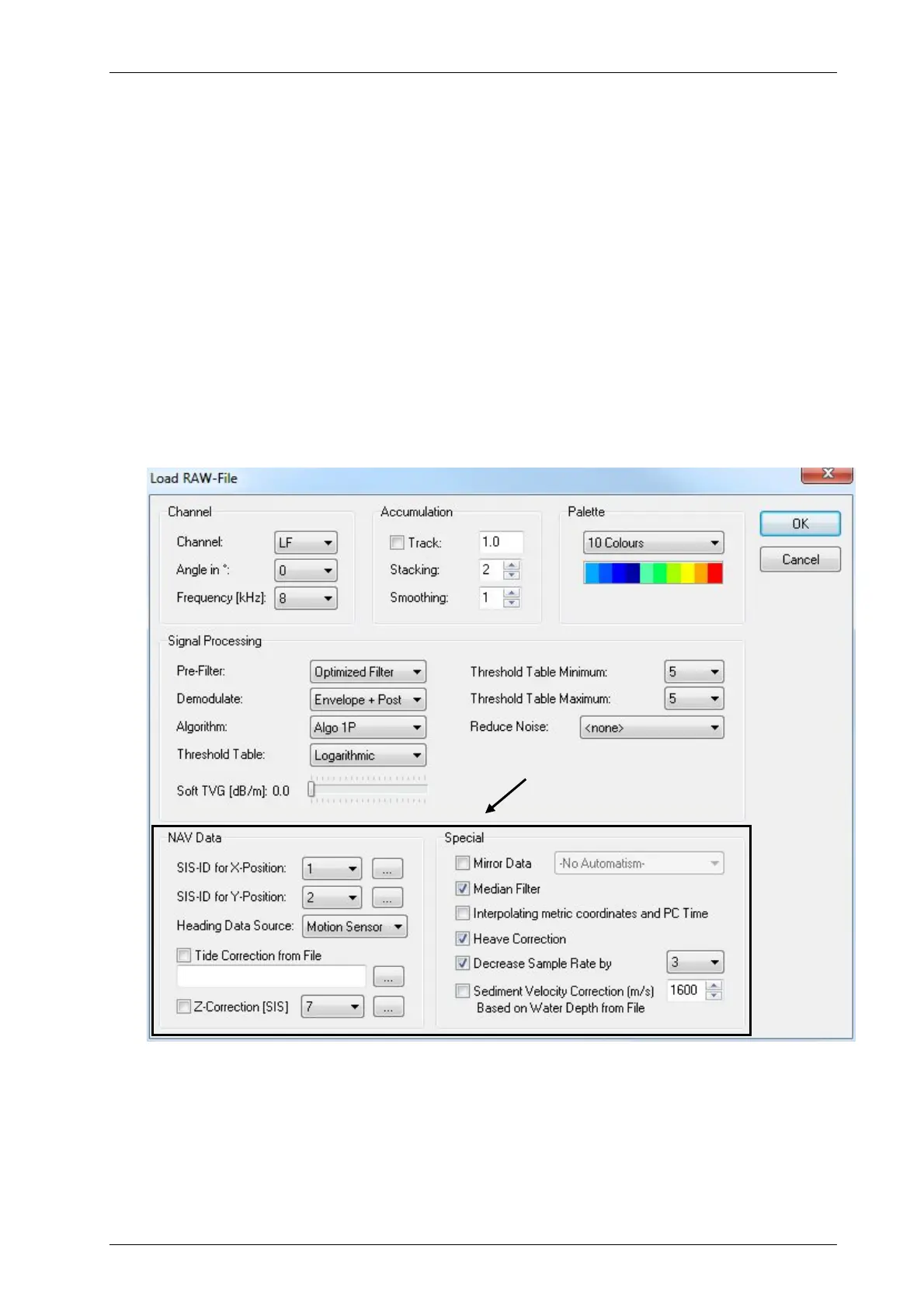 ISE Load RAW File dialogue with recommended settings for QA. The lower part of this dialogue (black