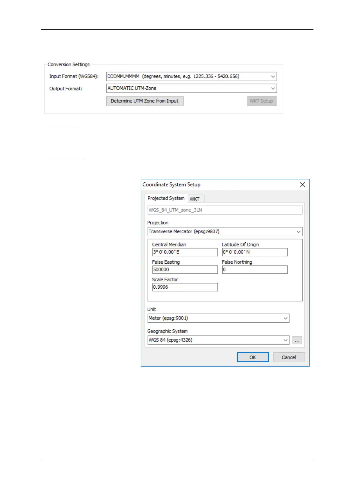 In this dialog you switch on/off the UTM conversion and specify the format of input data as well