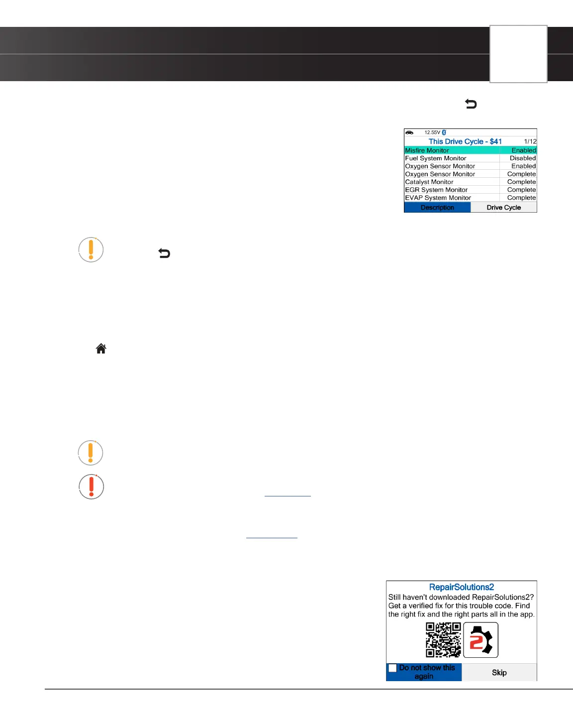 6. The Drive Cycle Procedure screen shows the specic set of operating procedures that ensure the vehicle is driven