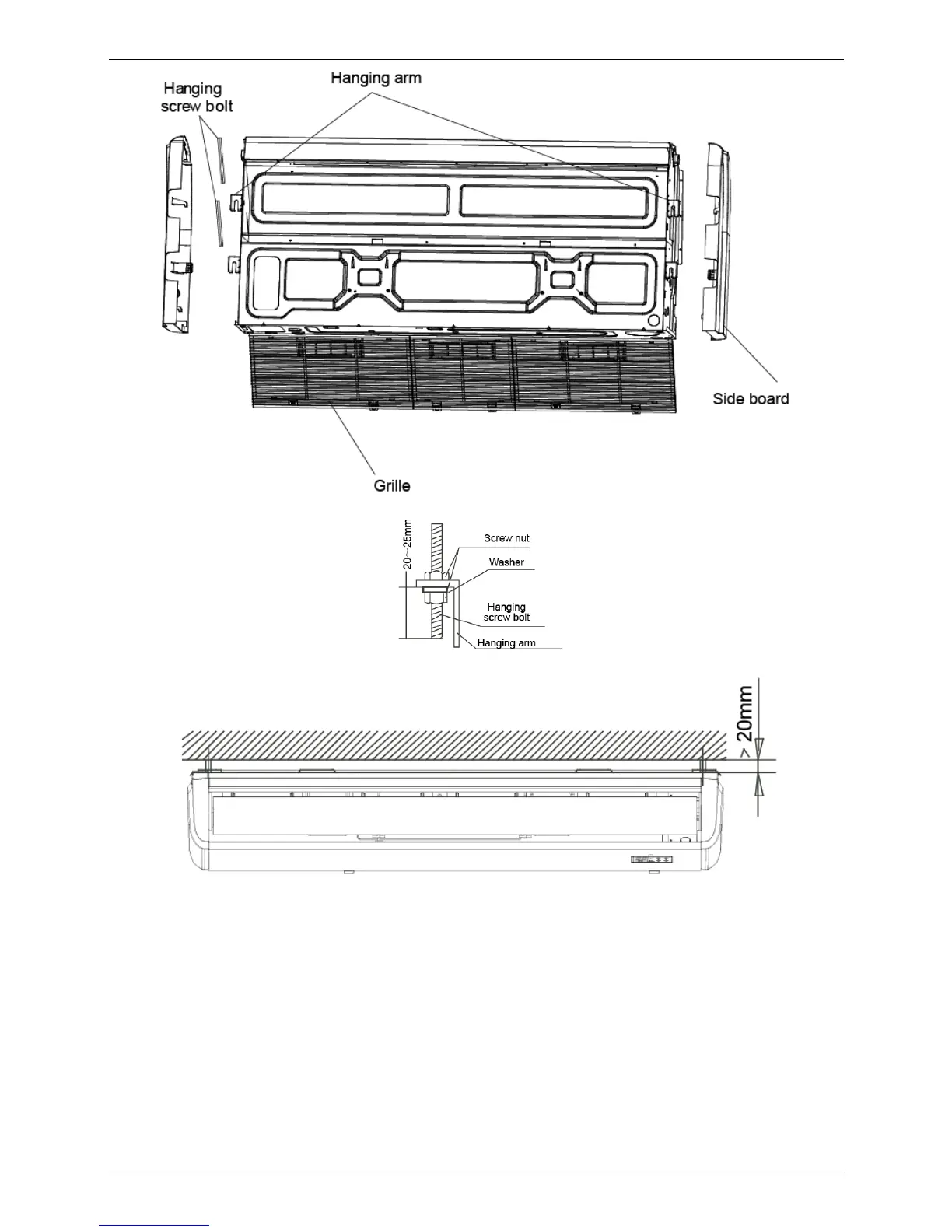 Locate the hanging arm on the hanging screw bolt. Prepare the mounting bolts on the unit.