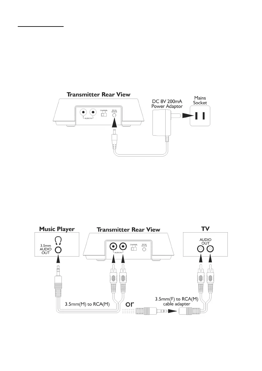 3. The transmitter can be connected to the audio output jack of a TV, Monitor, VCR, Radio, CD,