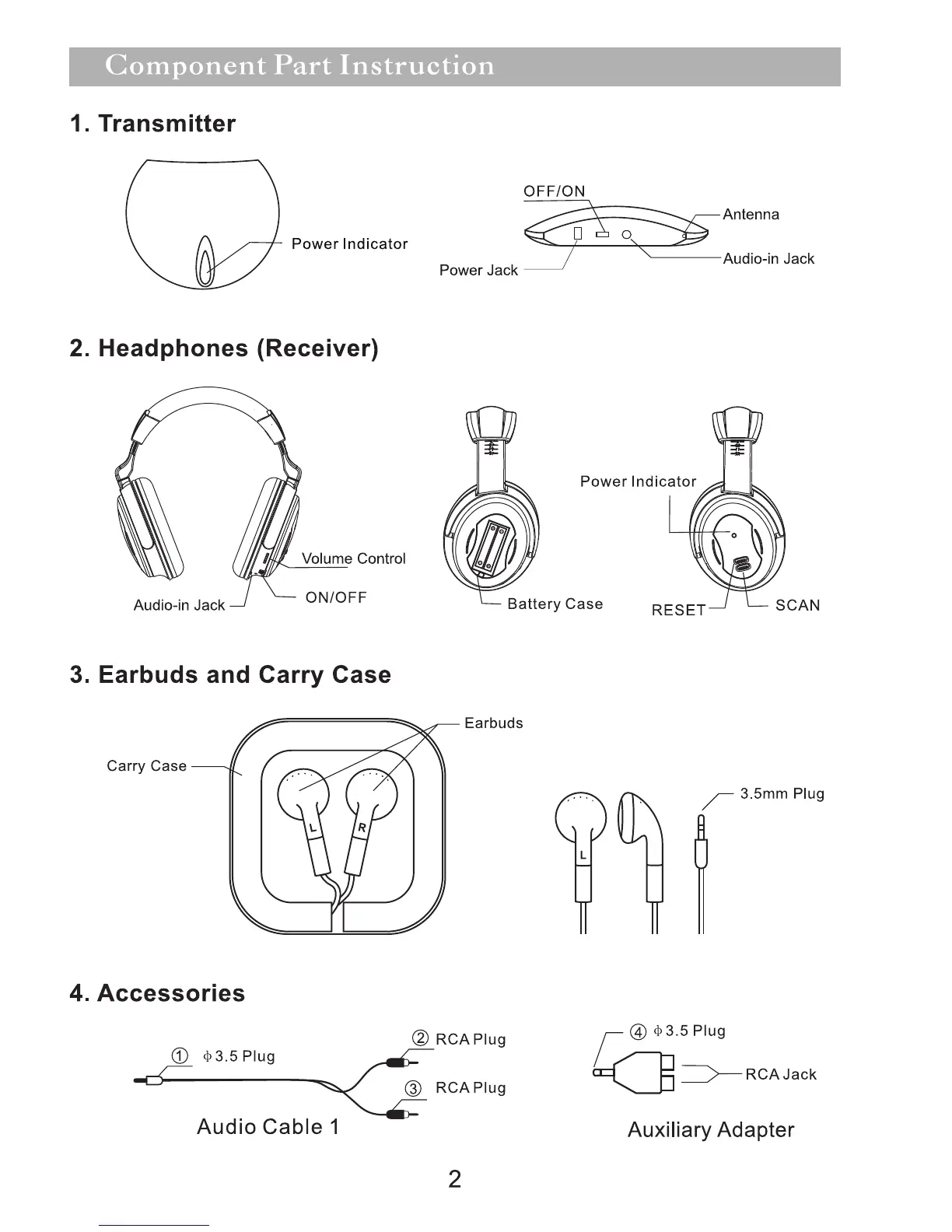 Innovative Technology ITHW-858B - Component Part Instruction; Transmitter Components; Receiver Headphone Components; Earbuds and Carry Case