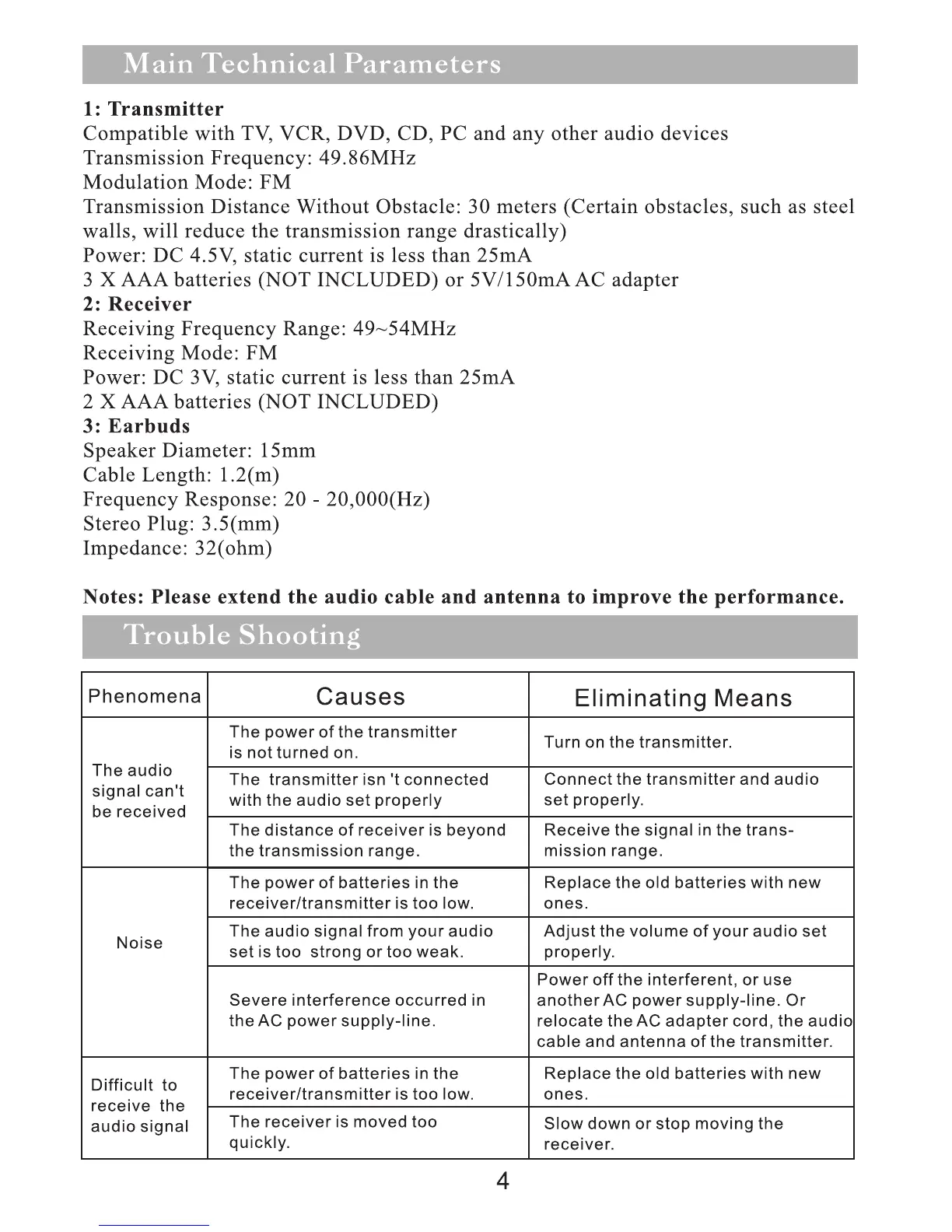 Innovative Technology ITHW-858B - Technical Parameters and Troubleshooting; Transmitter and Receiver Specifications; Earbuds Specifications; Troubleshooting Common Issues