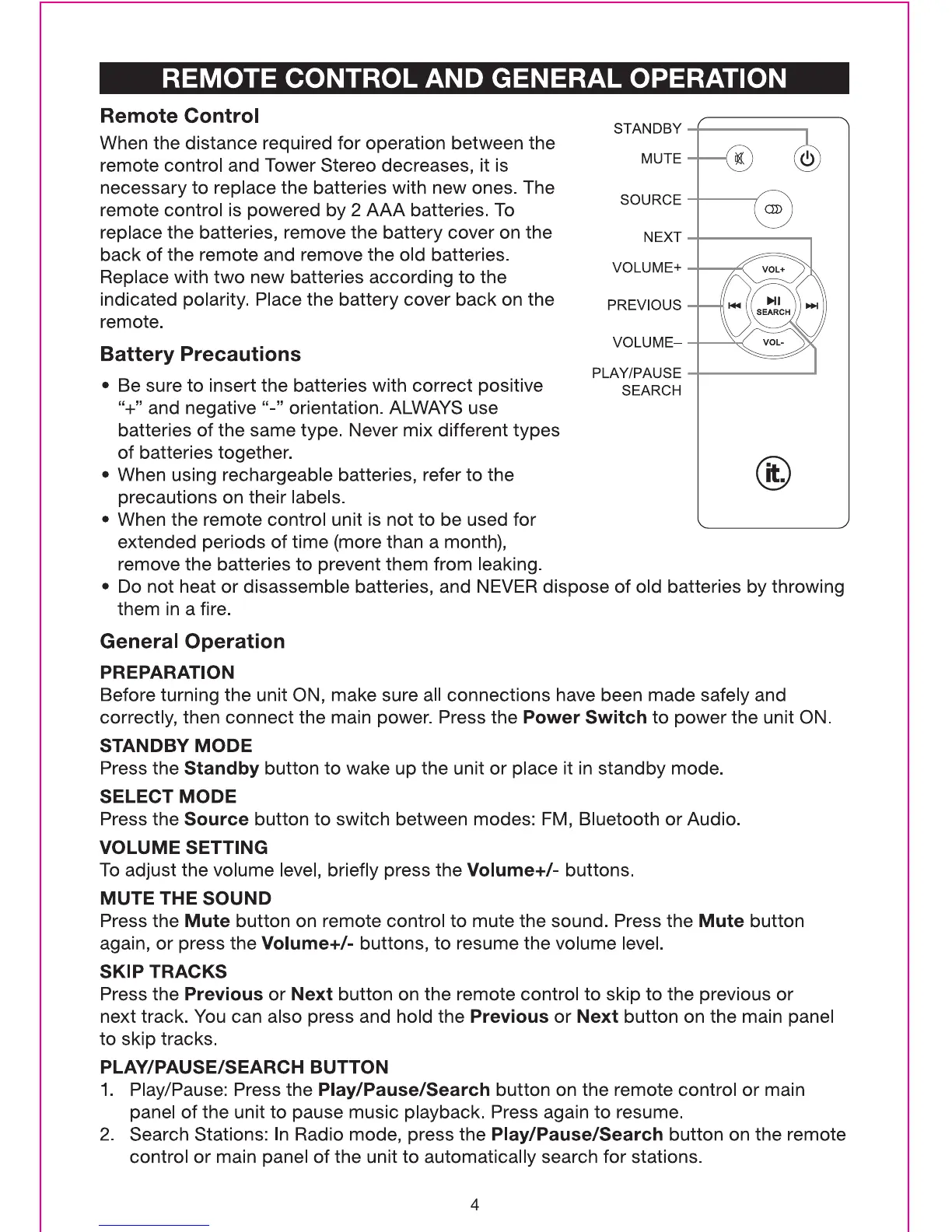 Innovative Technology ITSB-300 - Remote Control and General Operation; Remote Control Operation; General Operation