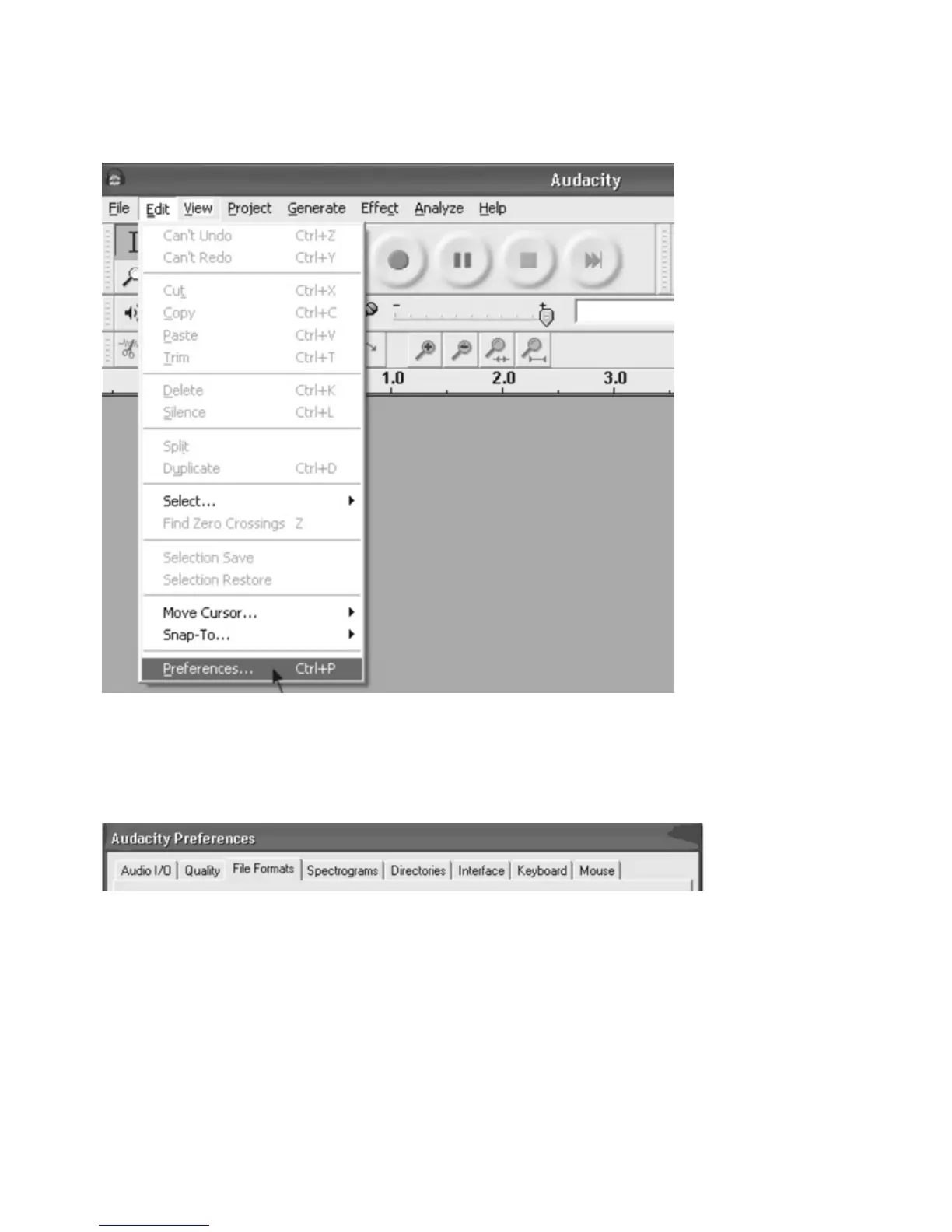 Click the “Edit” on the Audacity interface, select “Preferences”.